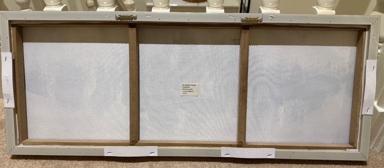 Next Grey / white / silver / Gold coloured canvas with sliver / bronze effect frame. 83cm long x 32cm wide x 4cm deep. Very good condition. Can be hung horizontalally and vertically.