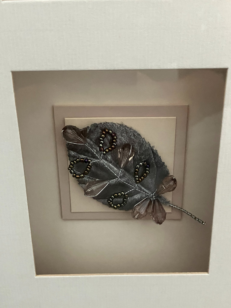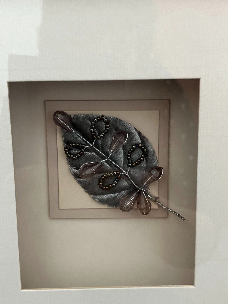 Three compartments with individual pieces of metal art designs inside.