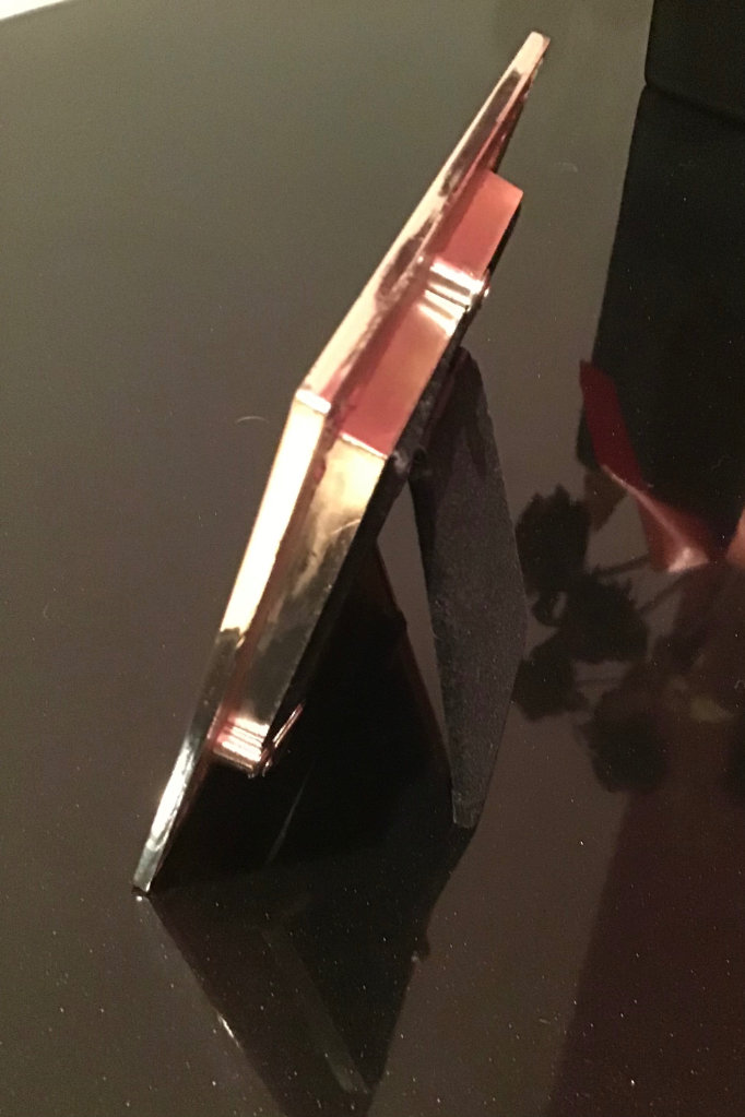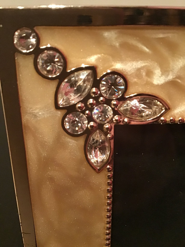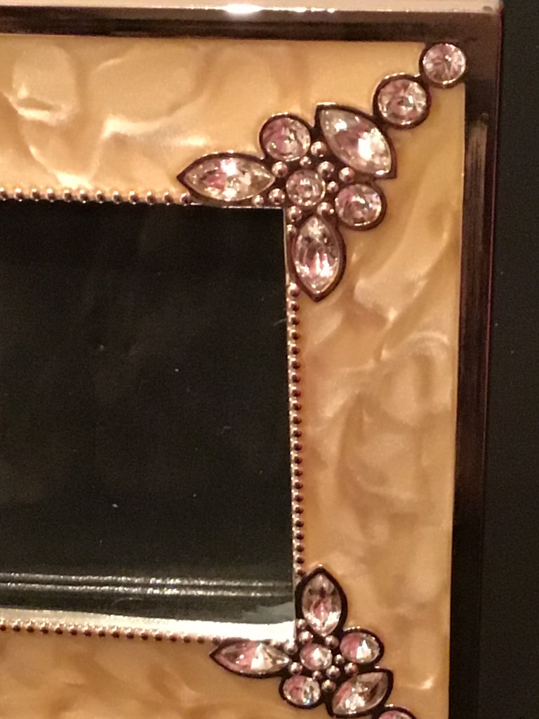 Decorative cream enamel photo frame from NEXT. Has silver tone beading detail and crystal butterfly-like details in each corner. This is a standing frame, 11.3cm x 11.3cm and suitable for photos or pictures measuring 6.5cm x 6.5cm.