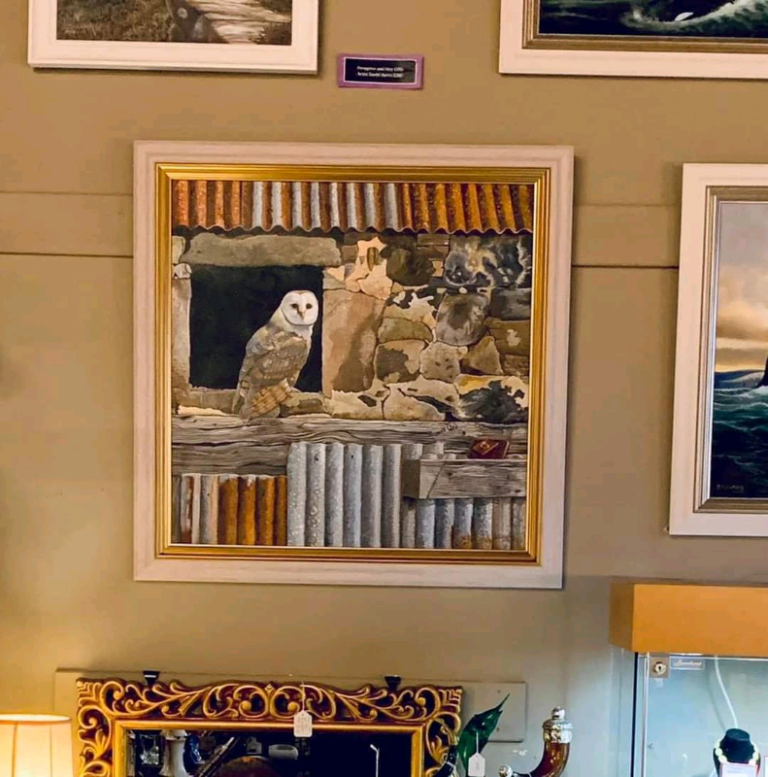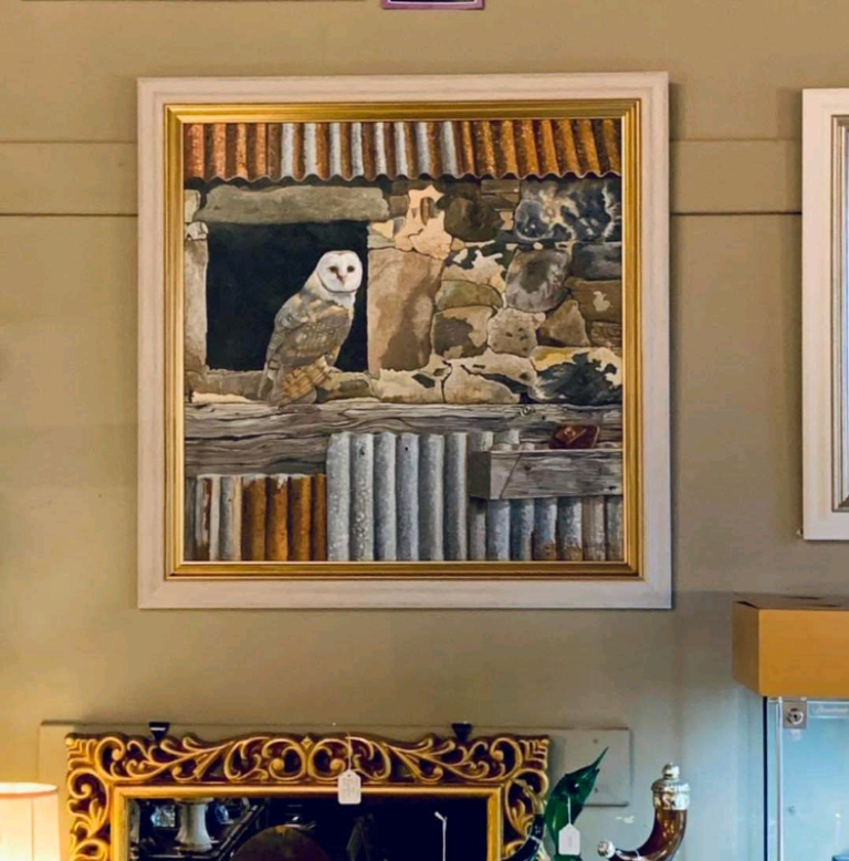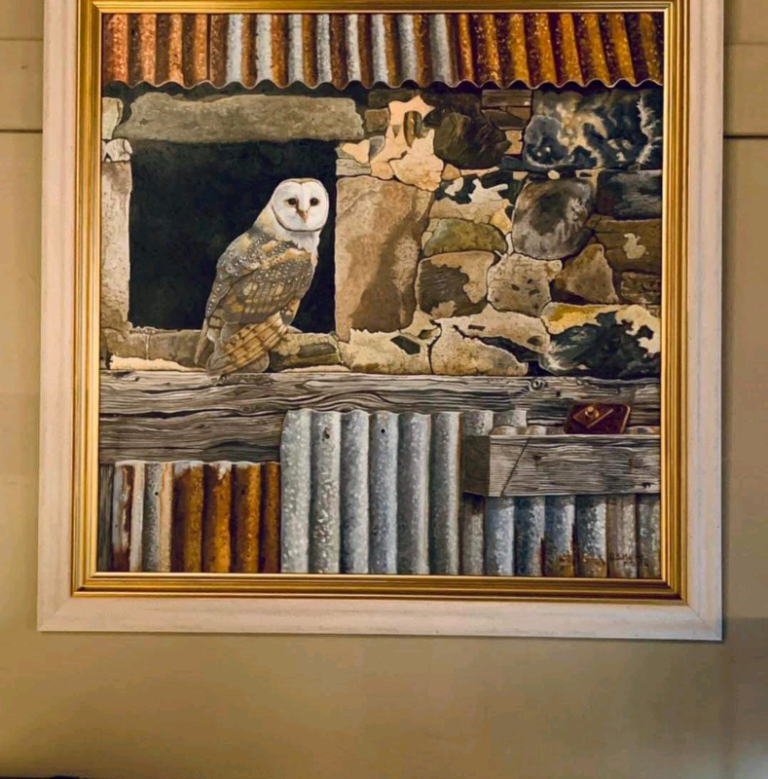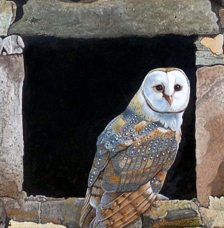 The detail on this beautiful painting of a Barn owl sitting in the window of an old farm steading near Aviemore is just amazing!