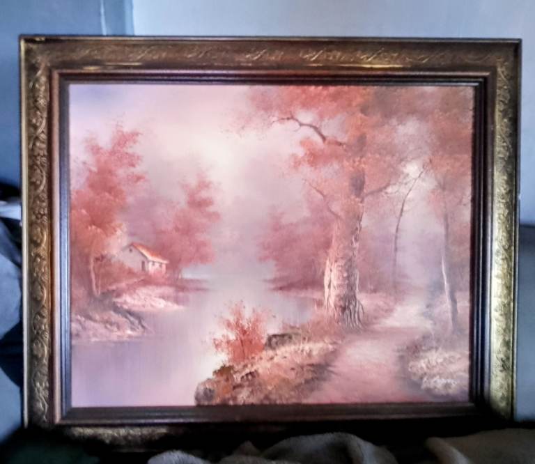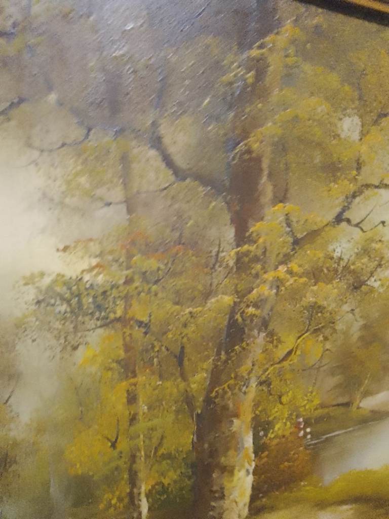 They depict tranquil outdoor scenes, with trees and water featuring prominently.