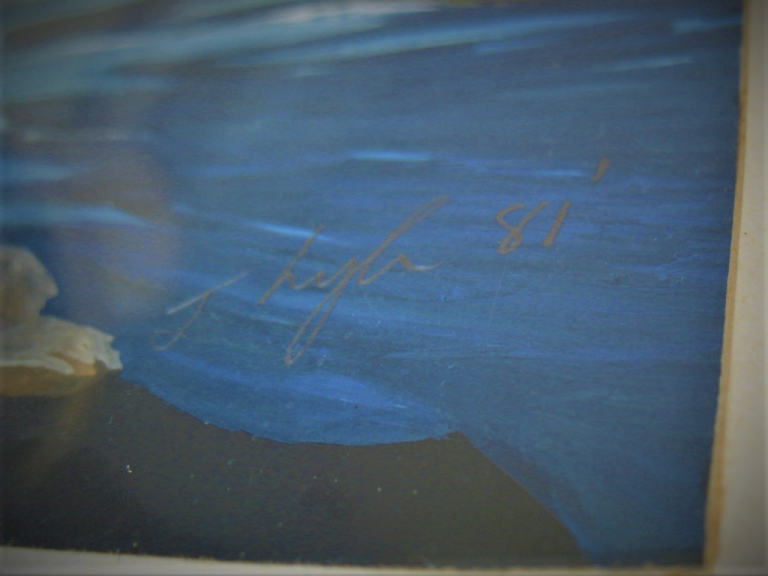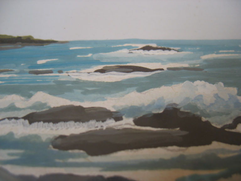 Picture/ painting behind glass from Tiree, Inner Hebrides, in water colours by J Lyle: Over the rocks to Ceann a'Bhara – hand signed and dated “81”. Frame size 39x51 cm. Sold as seen – near offers will be considered.