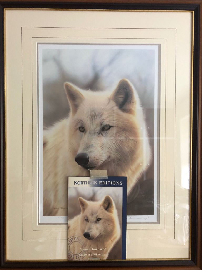 This beautifully framed canvas picture print is a stunning addition to any art collection. Created by Steven Townsend, a contemporary artist from the United Kingdom, the piece features a portrait of wolves in a striking multi-colour design. Measuring approx 28 inches in length and 22 inches in width( Frame ) , this large print is produced on high-quality canvas material and is signed by the artist. The item is a licenced reprint from 2002 and comes with a certificate of authenticity. It is handmade and features a portrait orientation.. The item is perfect for animal lovers or those who appreciate contemporary art.