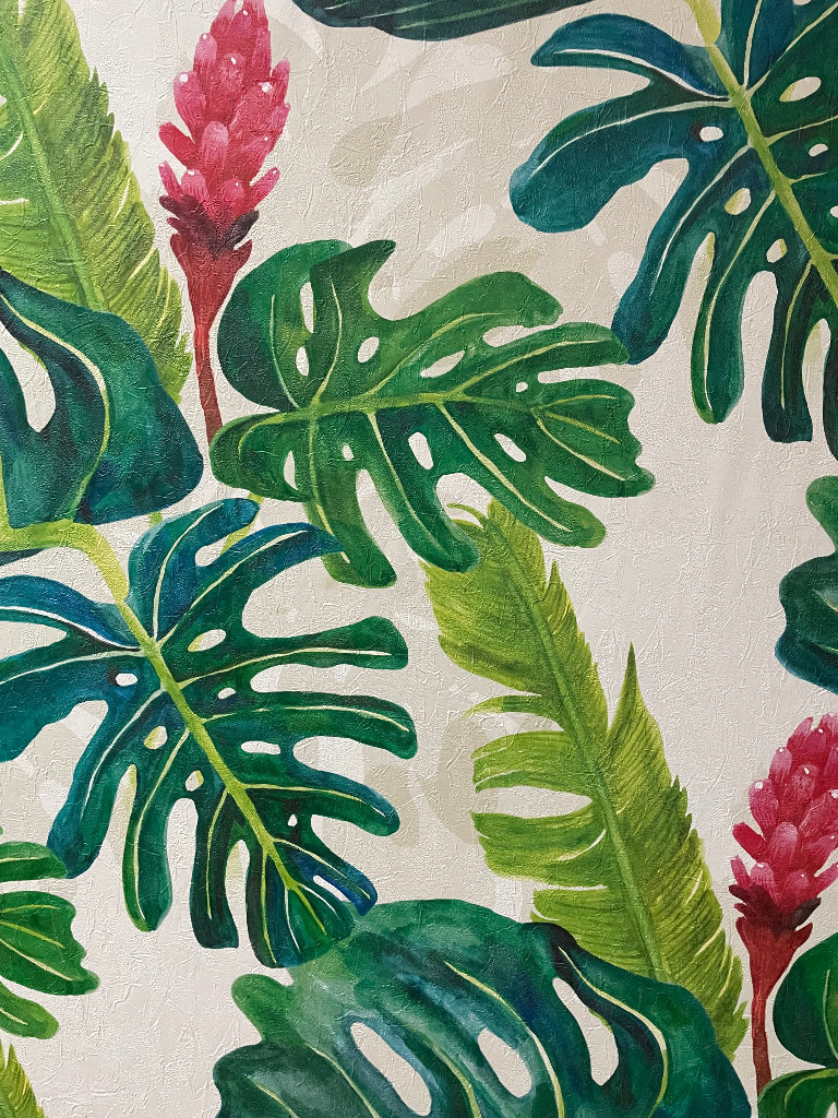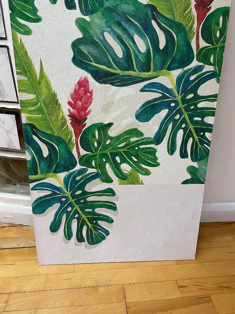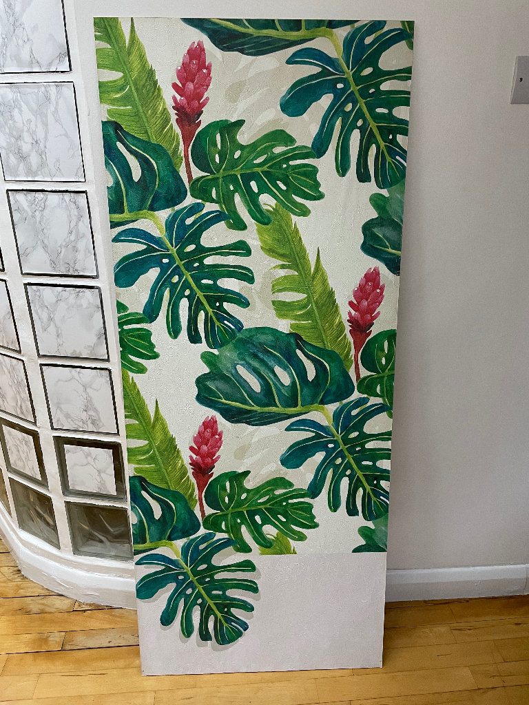 Large wall decor featuring vibrant green monstera leaves and red flowers printed on paper and mounted on an MDF board, against a white background. Perfect for adding a pop of color to any room. In excellent condition with no visible wear. (Illustration is done specifically for an design exhibition by local artist)