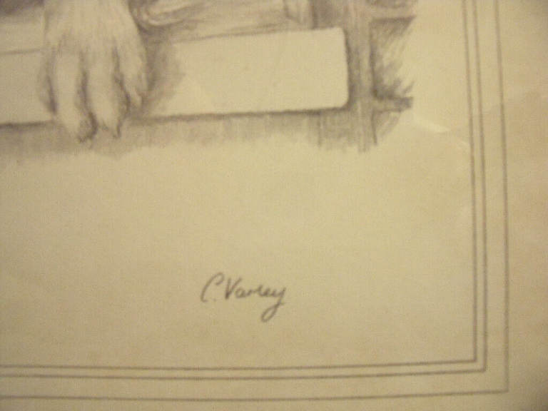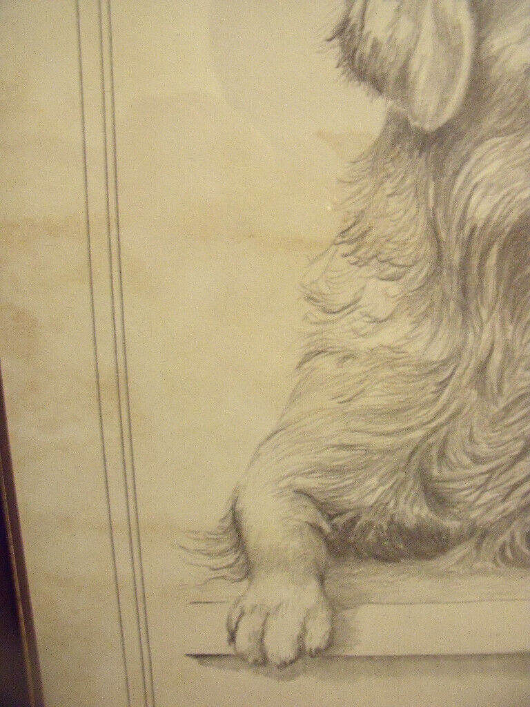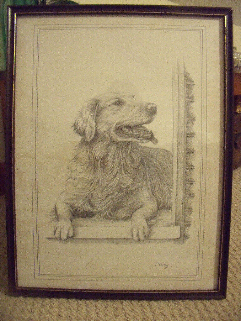Vintage C Varley signed framed black & white pencil sketch golden retriever, foxing.