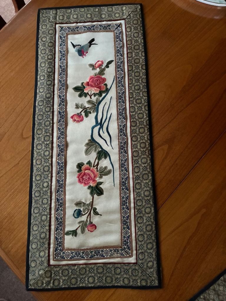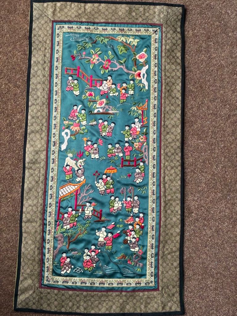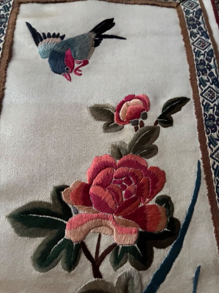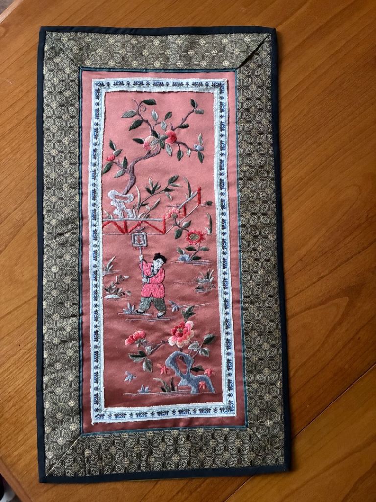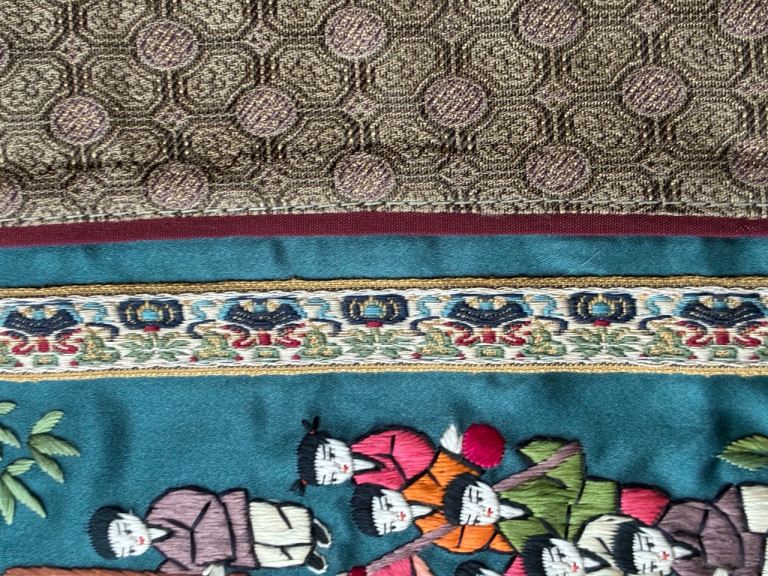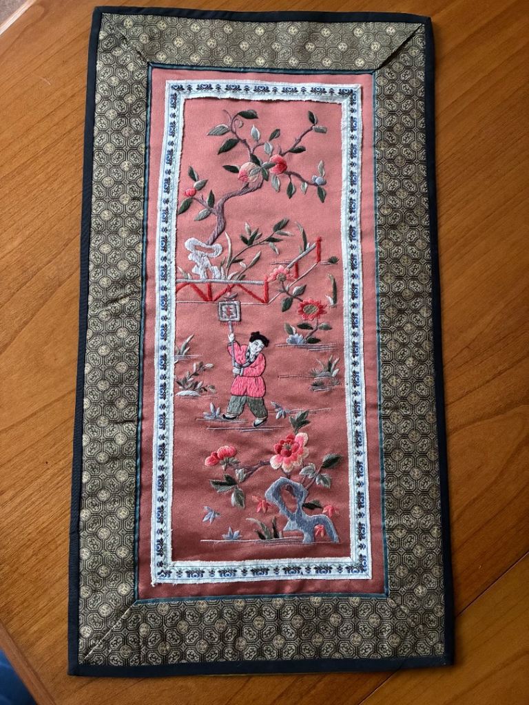 Three embroidered Chinese silk panels. Very good condition and no fading. Largest panel has a few marks on the back (see photo) but does not effect the silk on the front.