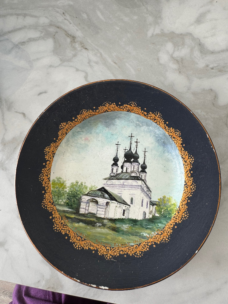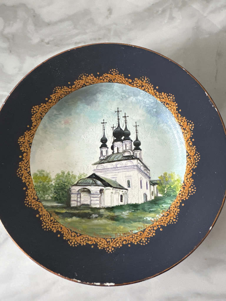 Vintage hand painted Russian wall plate with church view diameter 18 cm