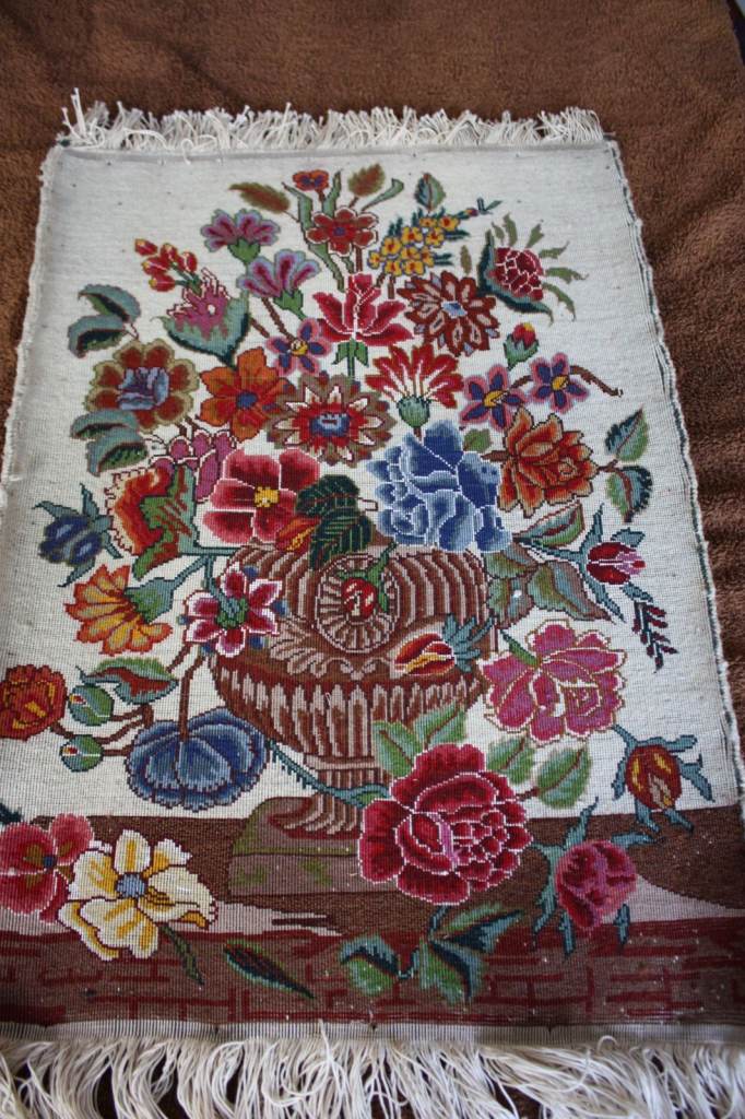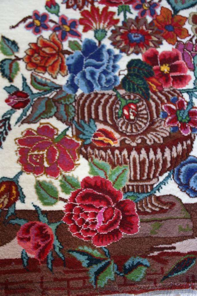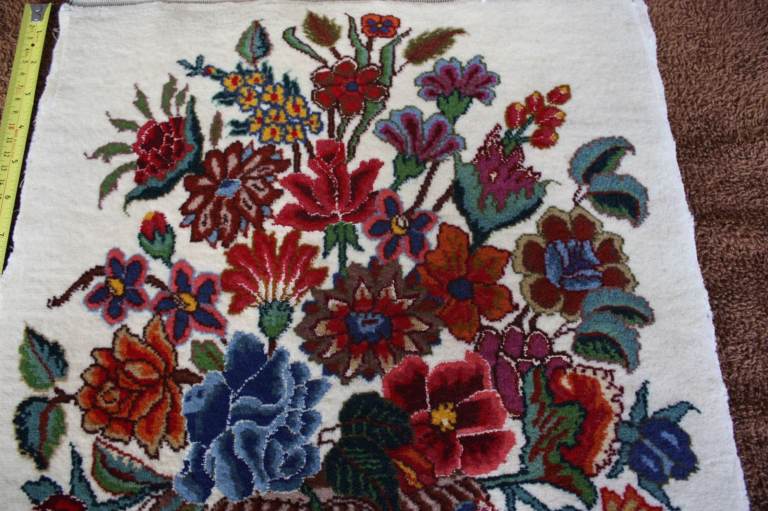 Woven carpet wall tapestry of a vase of flowers 'still life'. Tapestry is 59 x 41 cm and was previously framed for wall hanging.