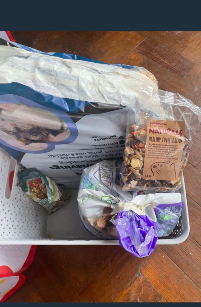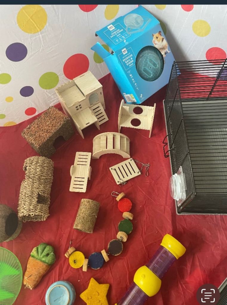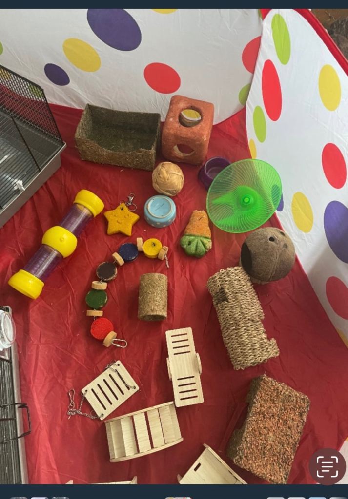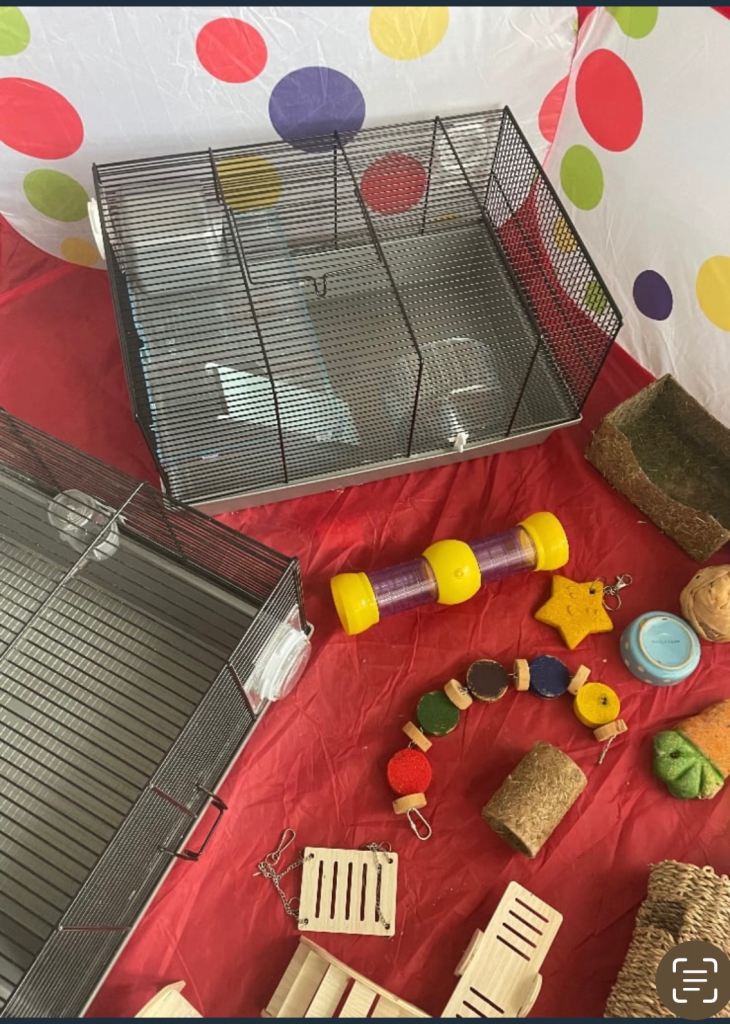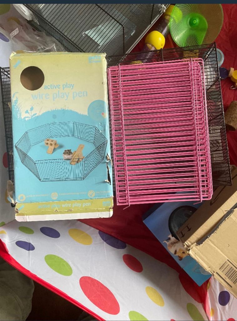 2 hamster cages(1 cage has locking clip missing on 1 side) 2 playpens ( 1 approximately 4ft diameter but folds up small)equipment/ toys / bedding/ treats etc