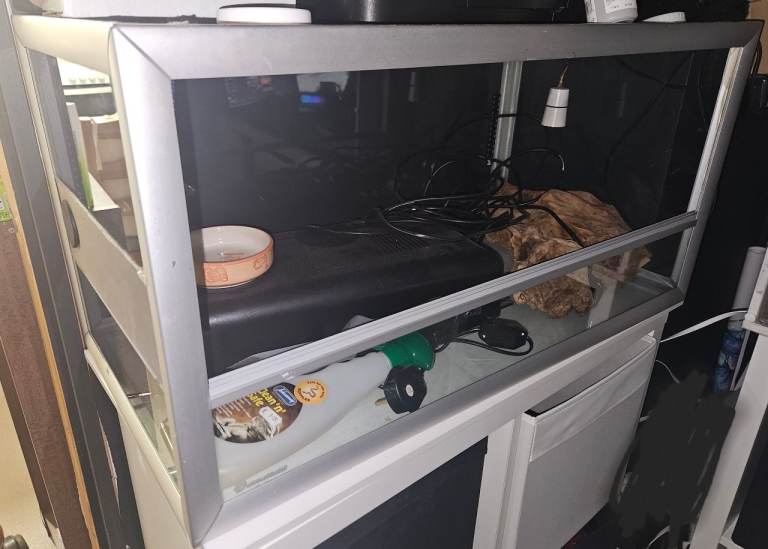 Has thermostat, heat mat, water bowl, large bog wood worth least £30 exo-terra hood light bulbs may need replacing, xl feeding tongues, telescopic snake hook, cleaning spray