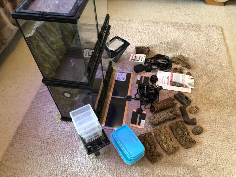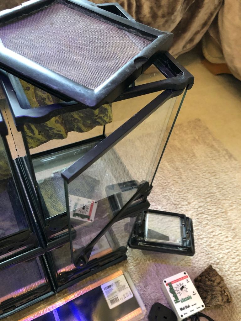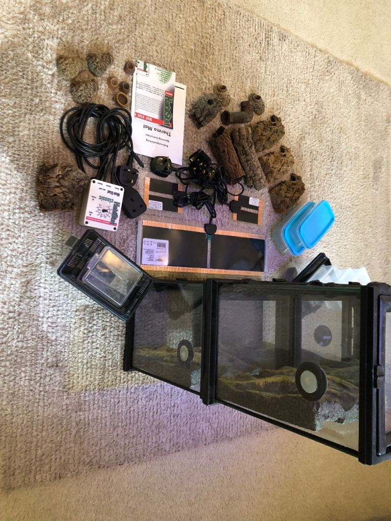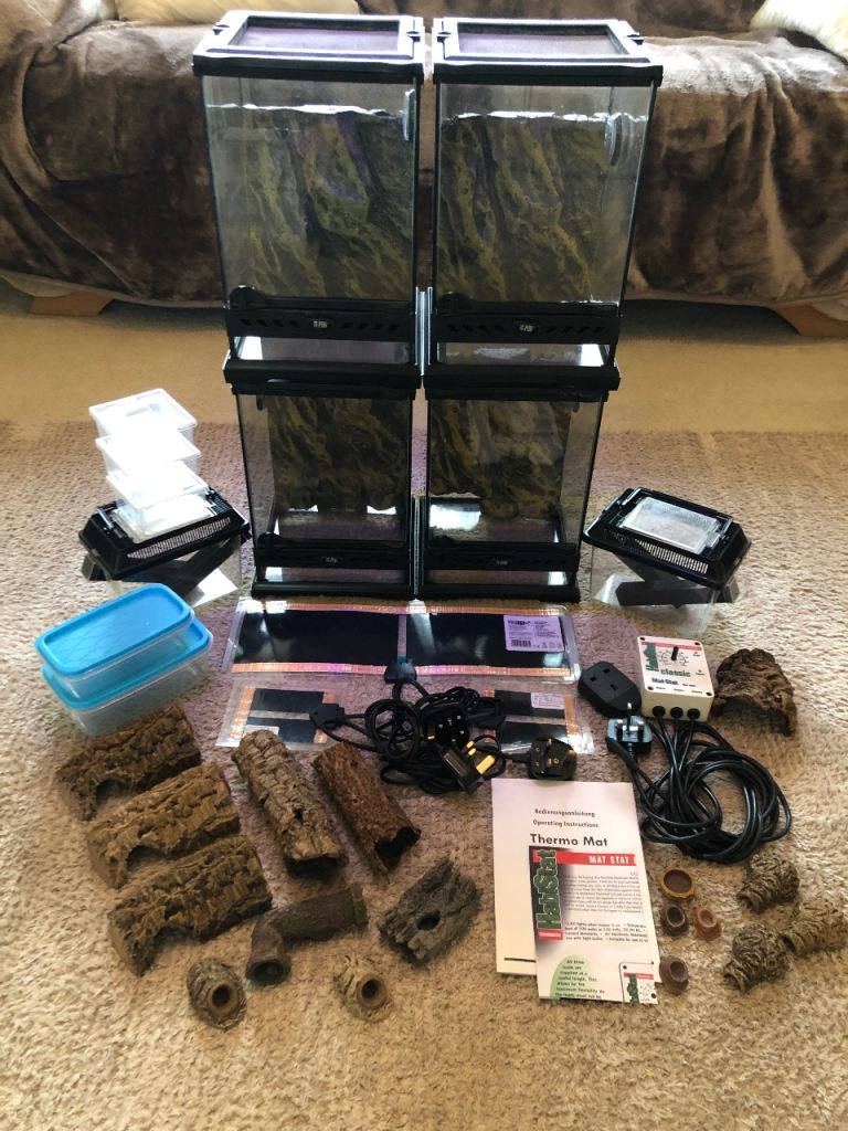 For sale this bundle of 4 exo terra terrariums 20x20x30H ( each have a humidity gauge fitted )heat mats , habistat thermostat , 2 cricket pens , selection of decor/hides as pictured and some plastic containers