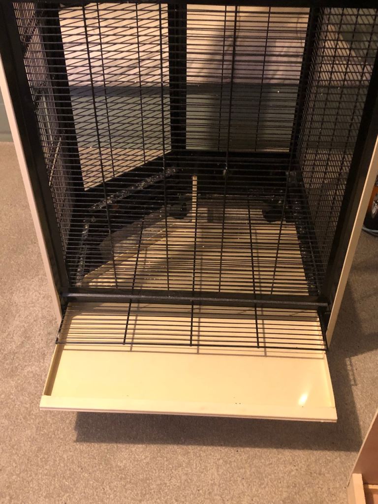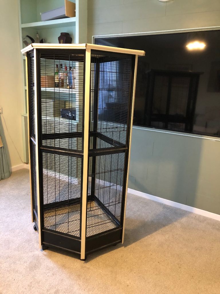 Five sided” ideal for corners” 5 feet tall bird cage, suitable for all birds. It’s on wheels for ease of movement and comes with a slide out dirt tray for easy cleaning. Comes with perches, swing etc. Colour black and cream.