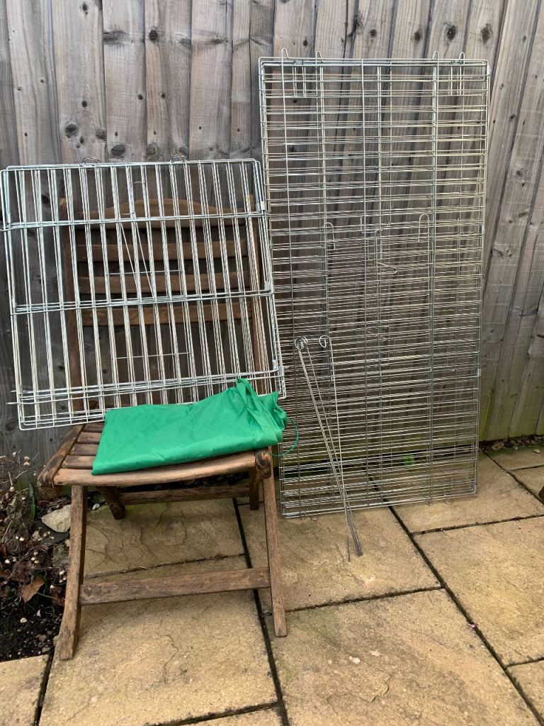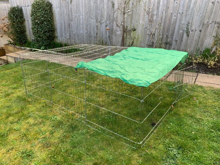 Strong metal cage with roof to protect from predators. Multiple entrances for ease of access. 4 pins to secure to ground. Easy to assemble and can be moved to different locations. Folds flat for storage. Always stored in shed.