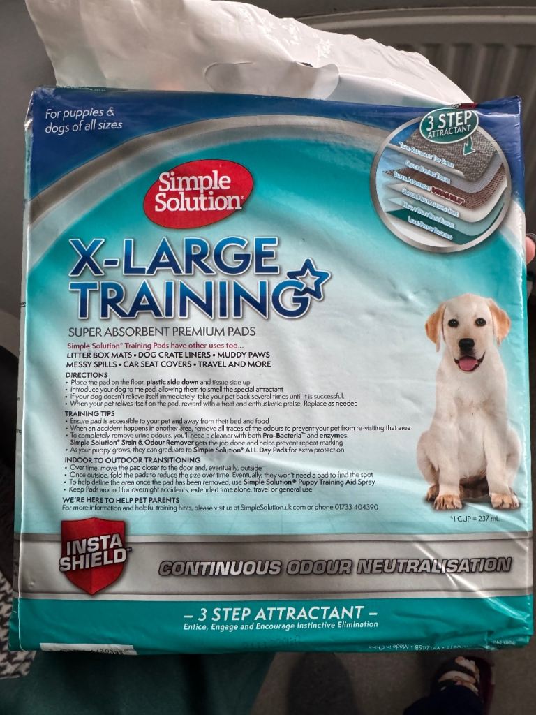 7 packs of 10 XL puppy training pads. Our puppy is no longer a puppy and so we no longer need them. RRP £8 each online.