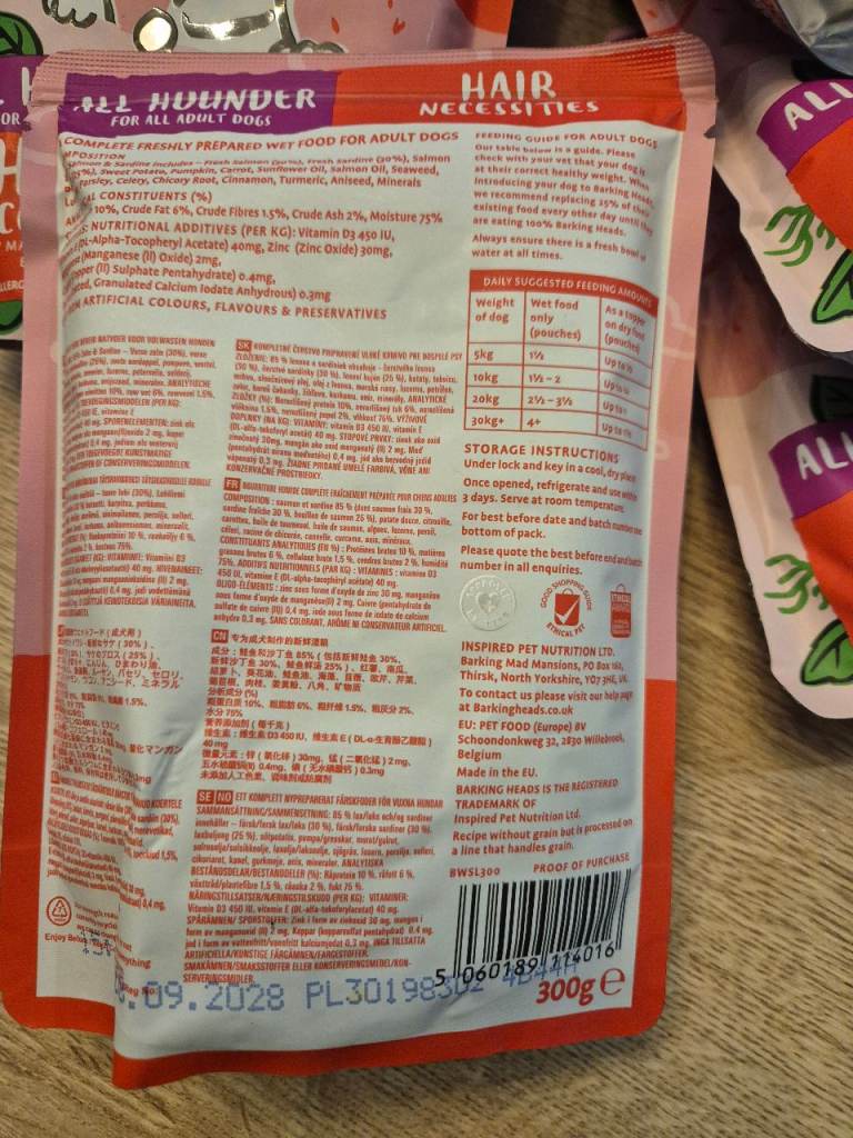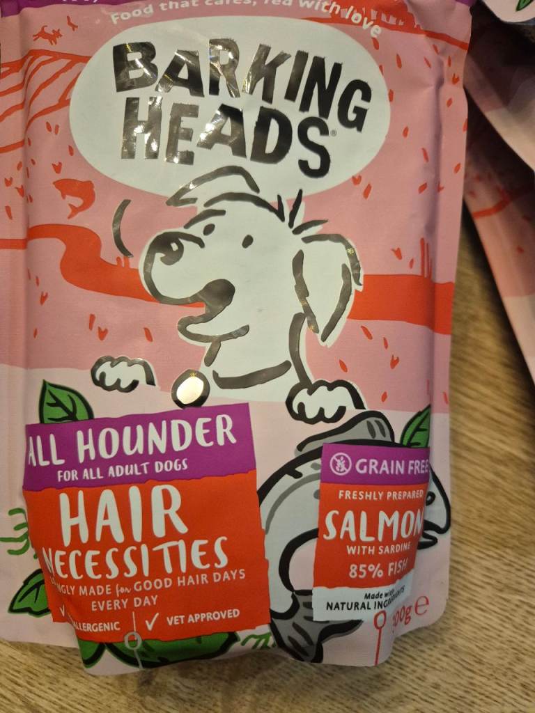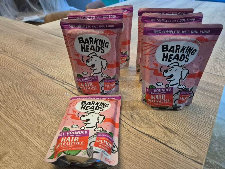 Barking heads salmon wet food for dogs. Had a variety box and my dog doesn't like the salmon one. Date until 2028 collection only fareham