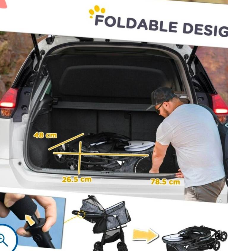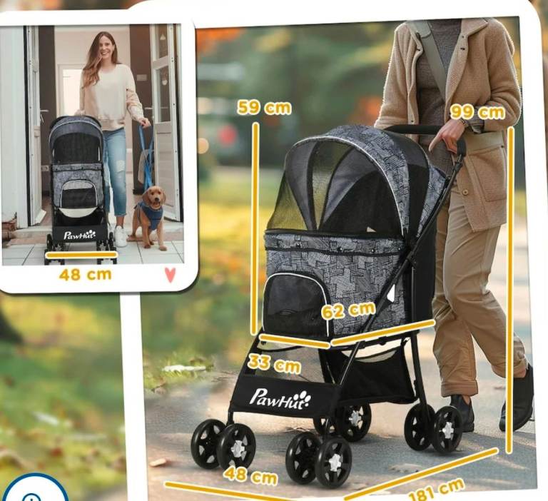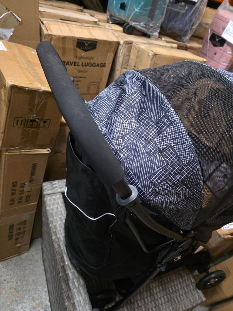 A new grey x black folding pushchair for a small dog it has 3 zipped compartments with folding hood and swivel wheels it has a removable custion and lead straps the measurements are enclosed in the pictures the r.r.p is 79.99 we are selling it for 40.00 we can deliver local in the s.o.t area only for a small charge or for collection or to visit to view it is st aidens Church summer Bank Road Tunstall st6 5ey we are there mon to fri 9am to 3.30pm Saturday 9am to 3pm closed Sundays sorry we only hold items for 24hours only sorry.