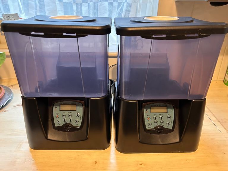 Two Automatic battery car feeders. Brilliant for being away or short vacation. Food is dispensed at set days and or times. For consecutive days. Or every morning if your cat nags for food.. You can record your voice or call sound to sound when the food is dispensed. Batteries last a very long time.