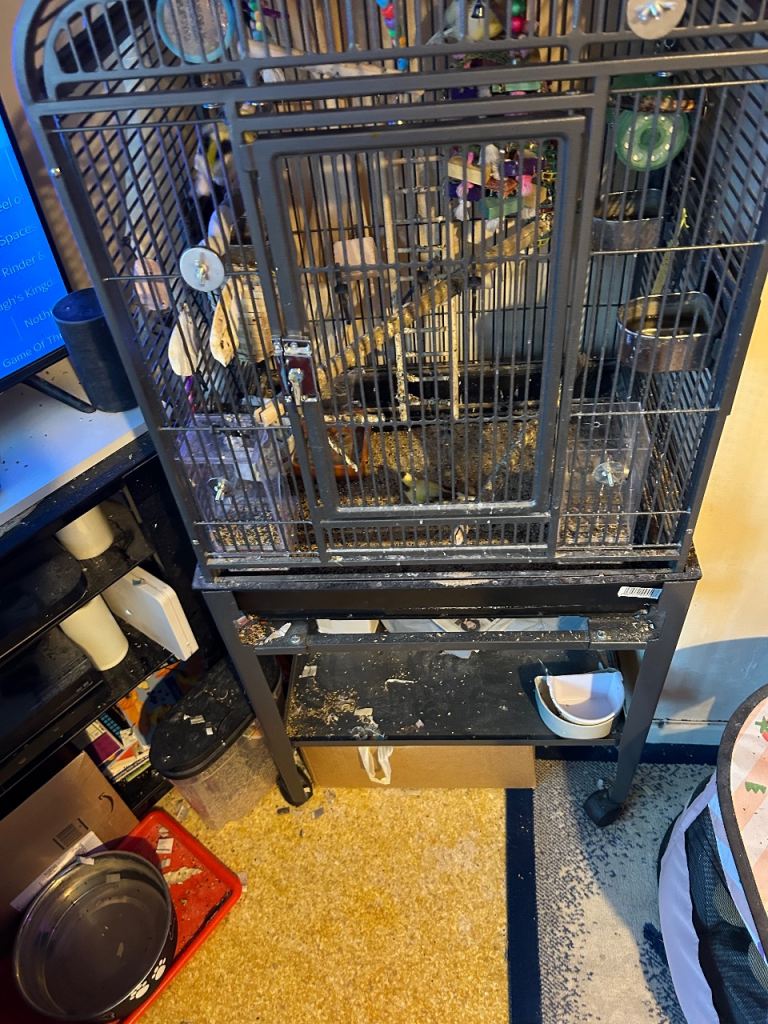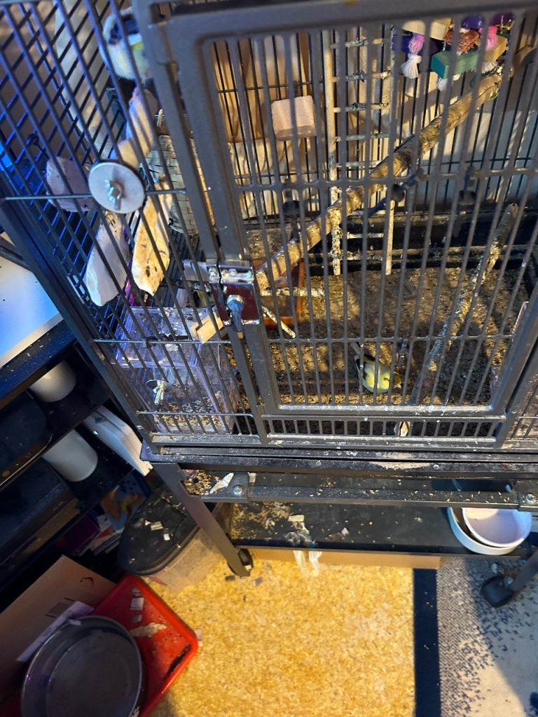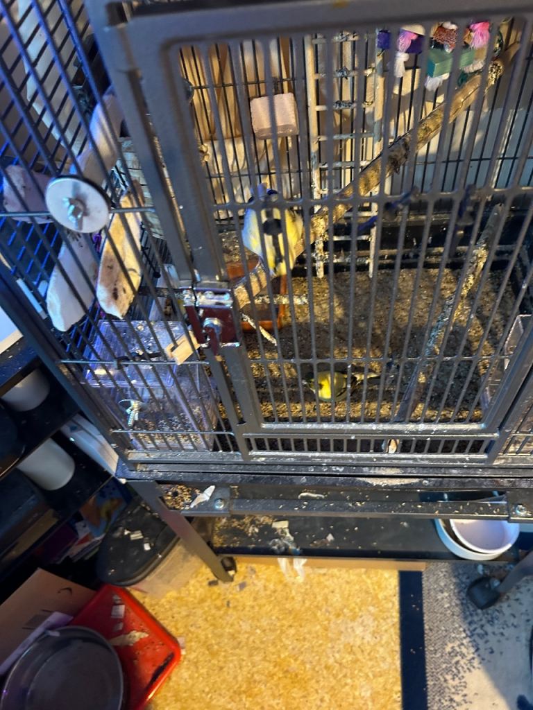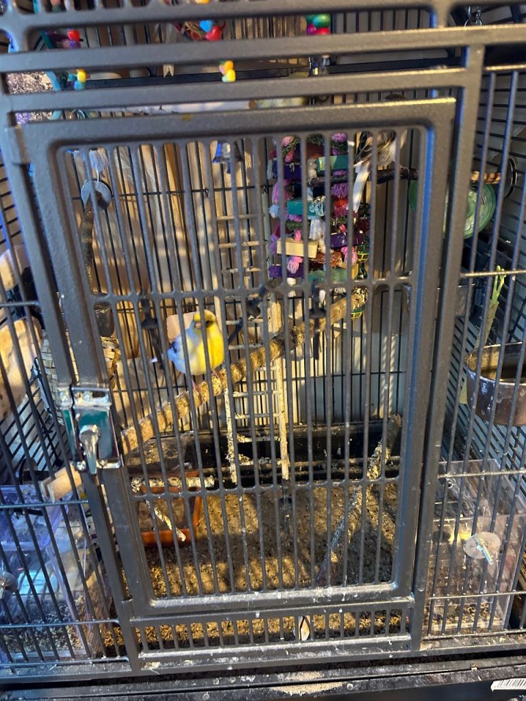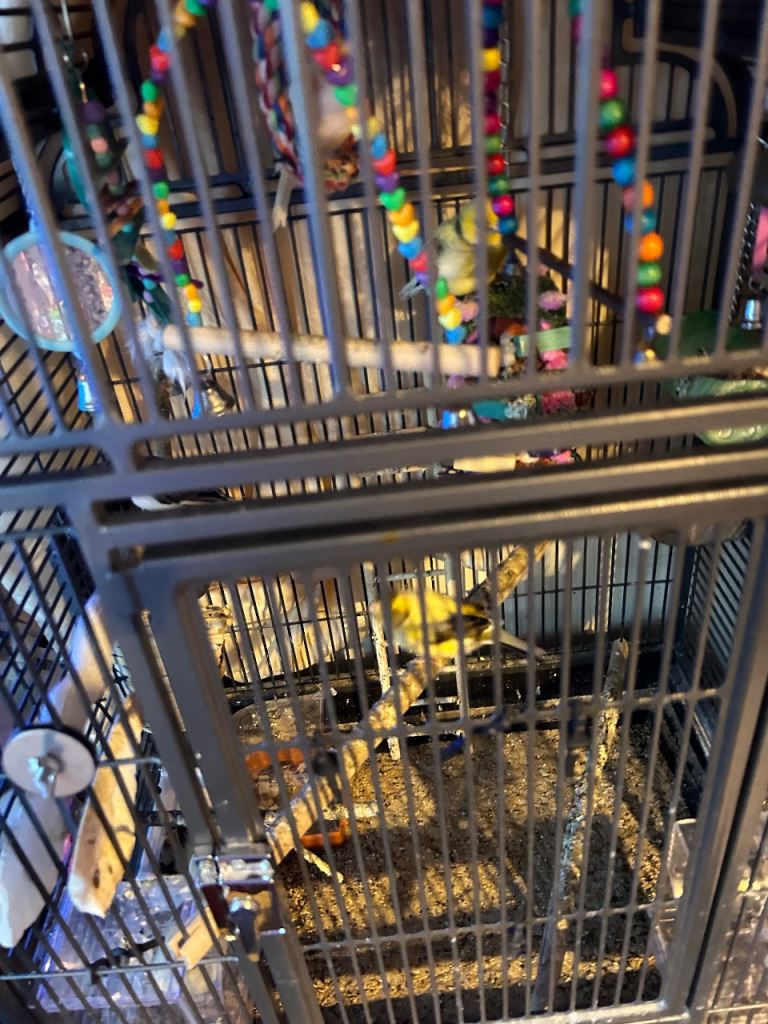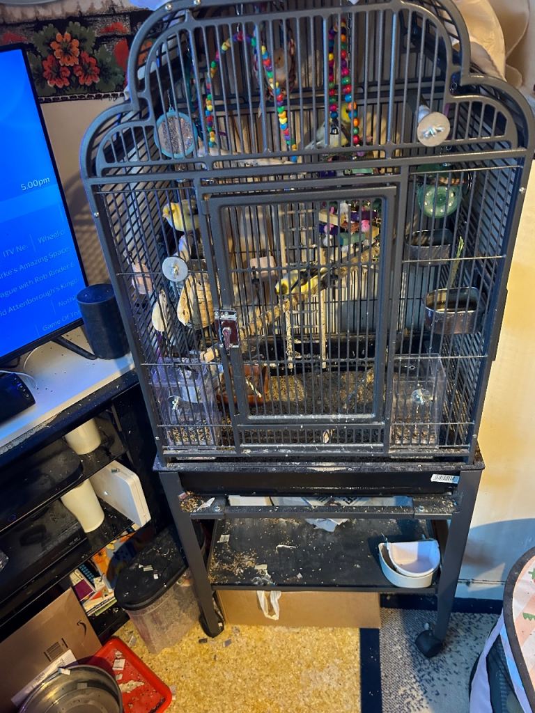 Large bird cage and stand complete with six breading Canaries and lots of accessories to the birdcage