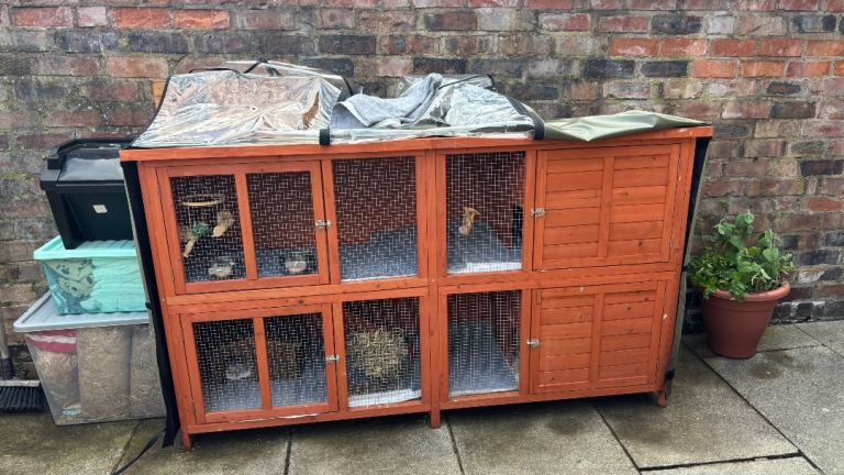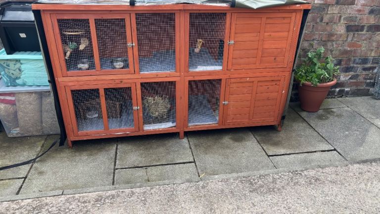Pets at home Bluebell hutch, has thermal cover which is a bit damaged but still works well and a few accessories included…. Hay feeder, wooden corner shelter, bowls, hanging mobile and a couple of battery powered lights for inside. COLLECTION ONLY…. L-6ft4in, H-3ft,9in, D- 2ft