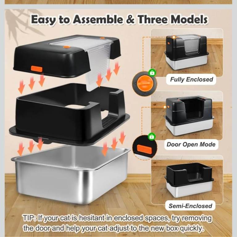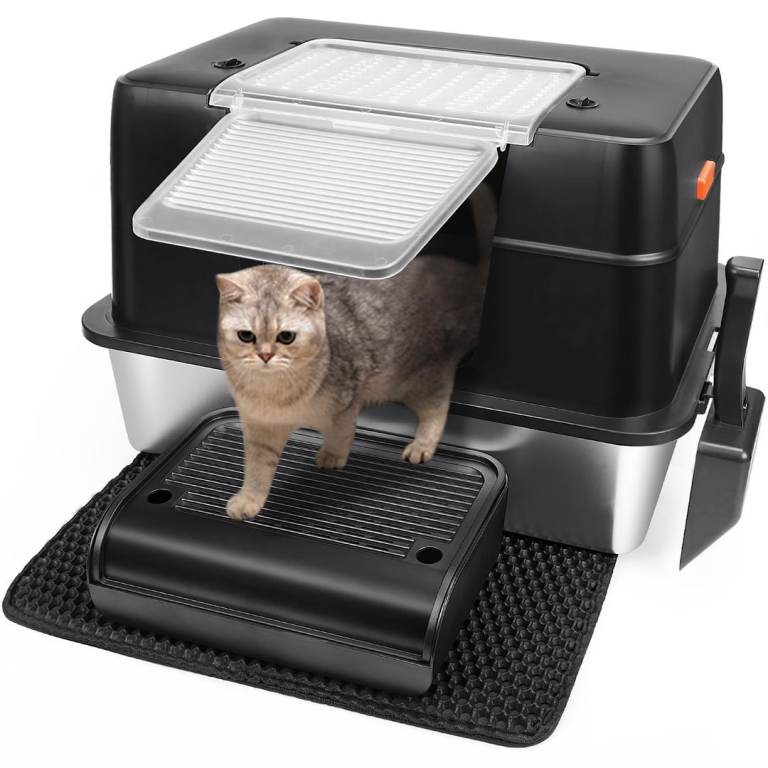 New Stock Vivifying Enclosed Stainless Steel Cat Litter Box with Lid, High-Sided and Removable Metal Cat Litter Tray, Leak-Proof Stainless Steel Cat Litter Tray with Scoop, Steps and Mat,60 x 40 x 39 cm (Black)