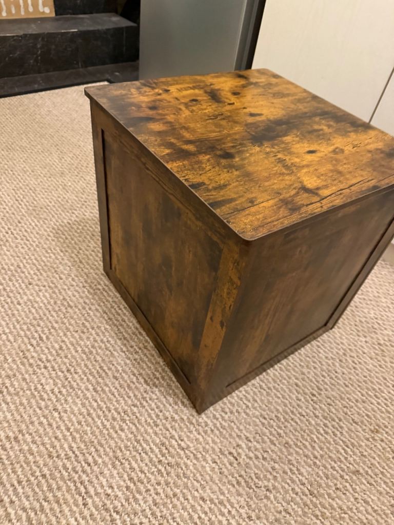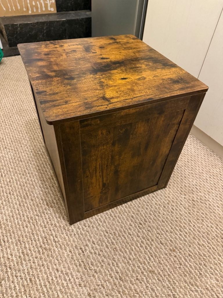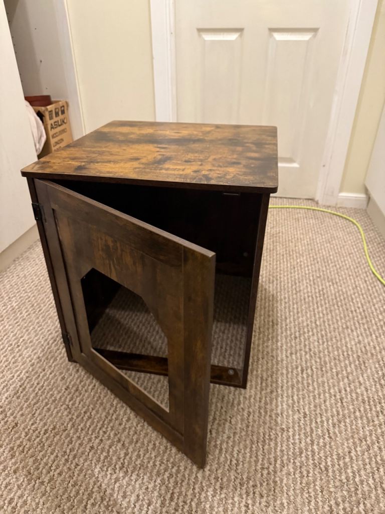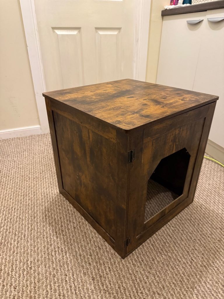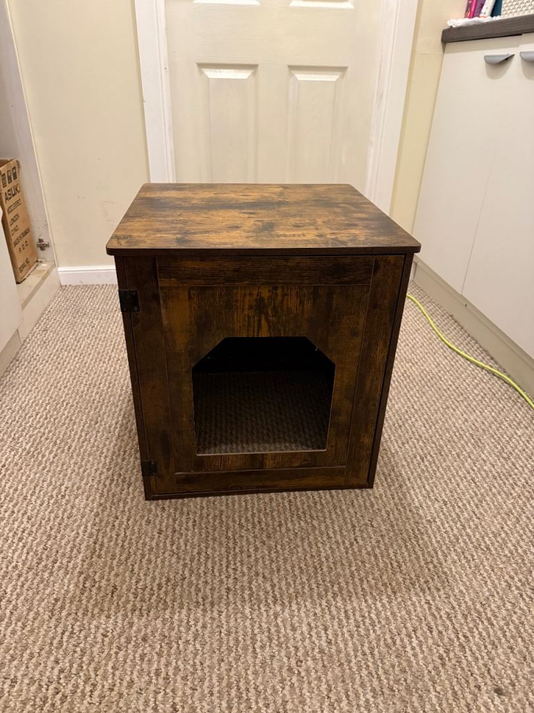 This is a wooden box which you can put your cat litter tray. It looks like a piece of furniture so will fit in many rooms in the house.