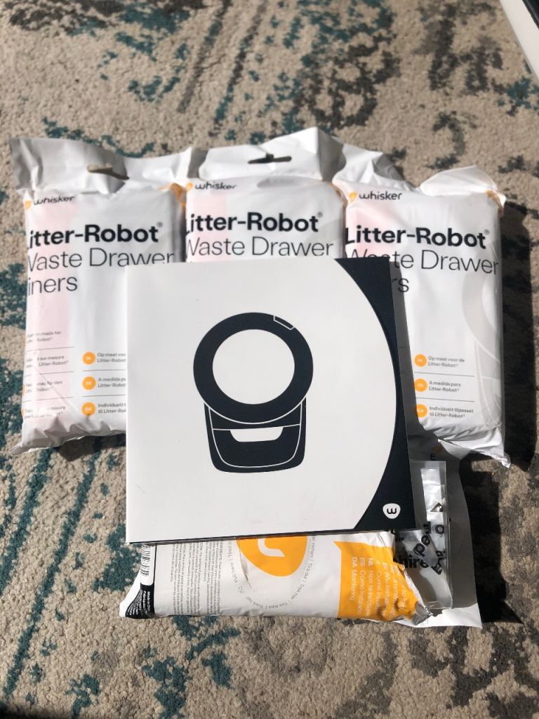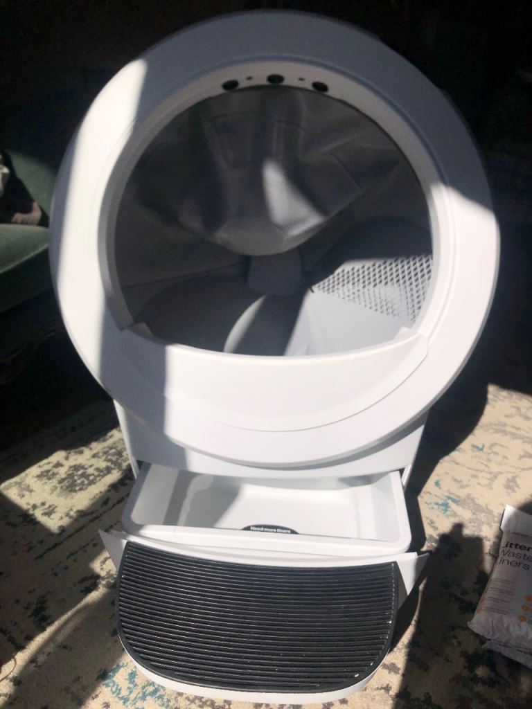 This litter robot has only been in use for a short while, and is almost new. There is no damage and everything is working as new. There are almost 4 full packets of waste bin liners and a small mat included too.