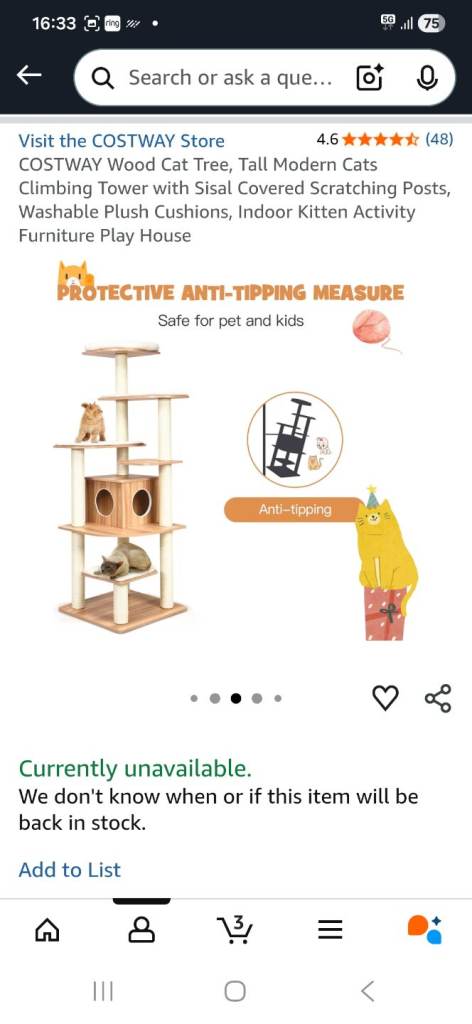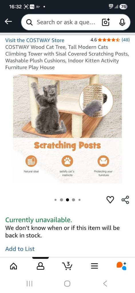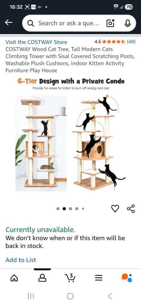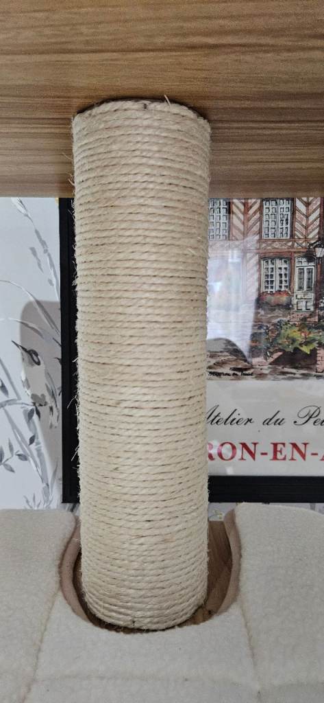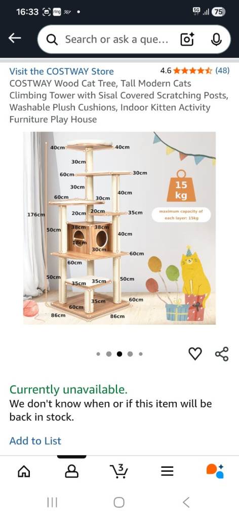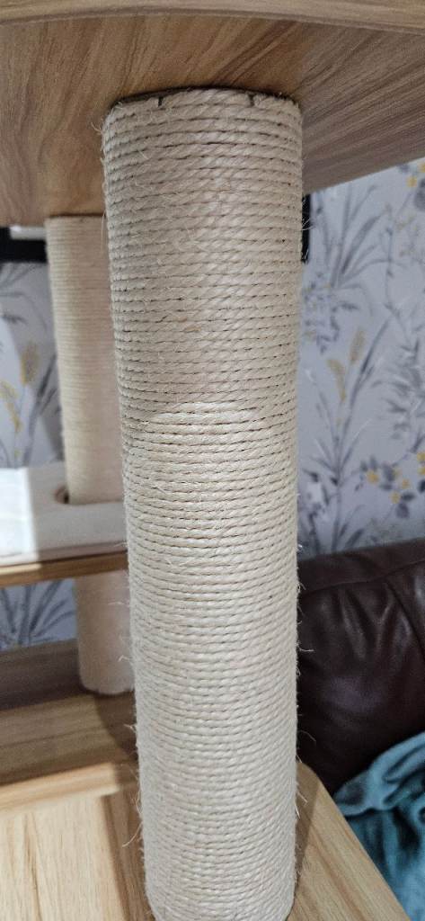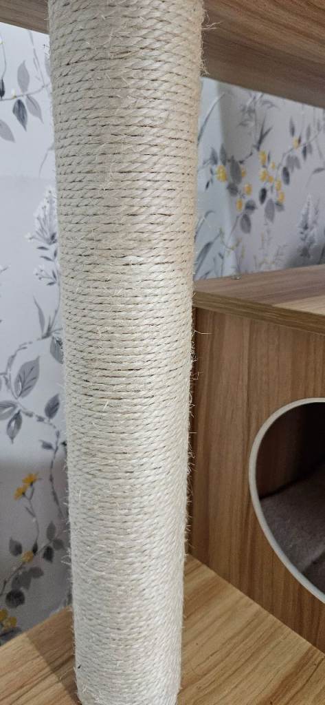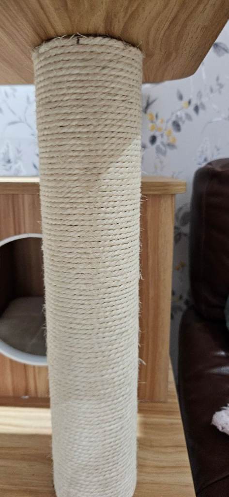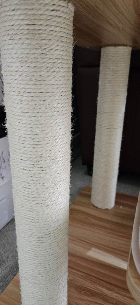 This cat scratcher/tree has been up for a few months and after almost 2hrs building it, the only part the cat uses is the very top, not even the scratching posts! The bed at the top has been washed but still has some fur left behind so I have taken it off of the item but it can be part of the sale or an alternative bed of your own choosing can be added. As all of the soft pads are stuck down with velcro and the tree is wooden it is easy to clean. Good brand COSTWAY. It was originally purchased from Amazon at £115, so I have posted the measurements from there.