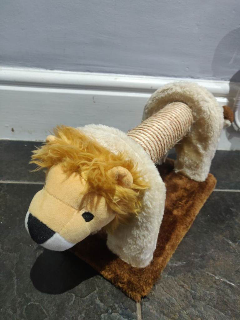 Cat scratcher that looks like a lion with a tail that has a rattle.