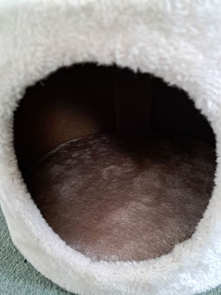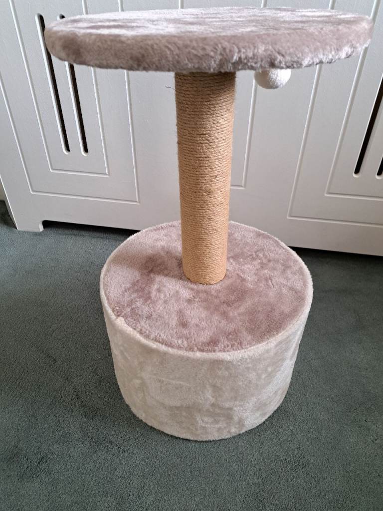 Beige Cat Scratching Post with built in bed and platform, size approx 57cm high by 33cm wide (22" x 13"),hardly been used as the cat preferred to sleep in the box it came in more than the bed.