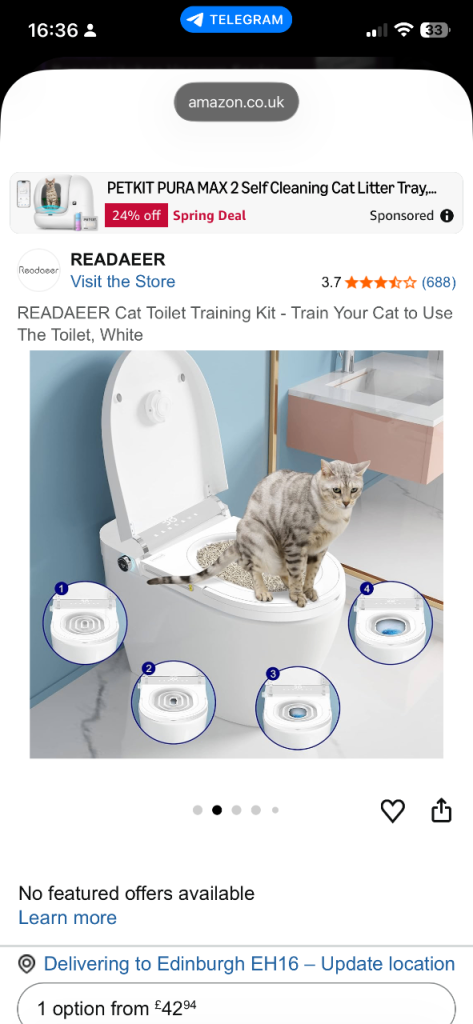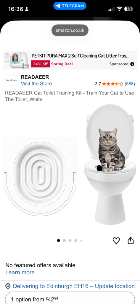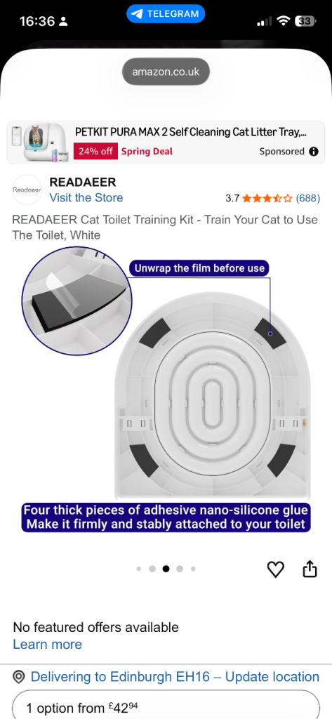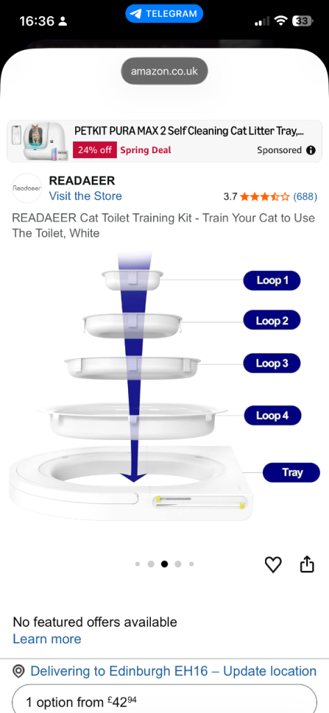 We successfully used this kit to train our cat to use a human toilet. Since then, it's been stored in our garden chest. I'm currently decluttering and would love for this to go to a new home rather than a landfill.