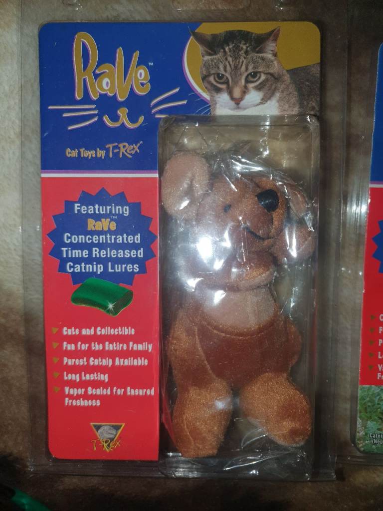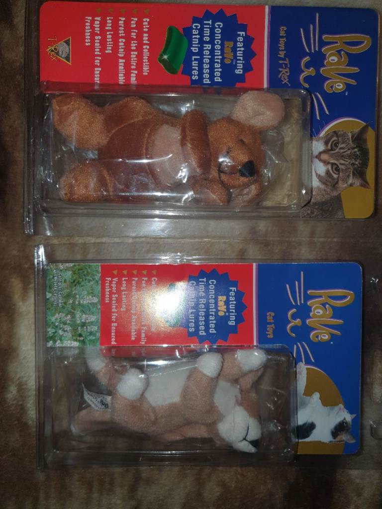 Rave cat toys by t-rex featuring concentrated time released catnip lures brand new I have 56 I want £2 each or will take £80 for the lot
