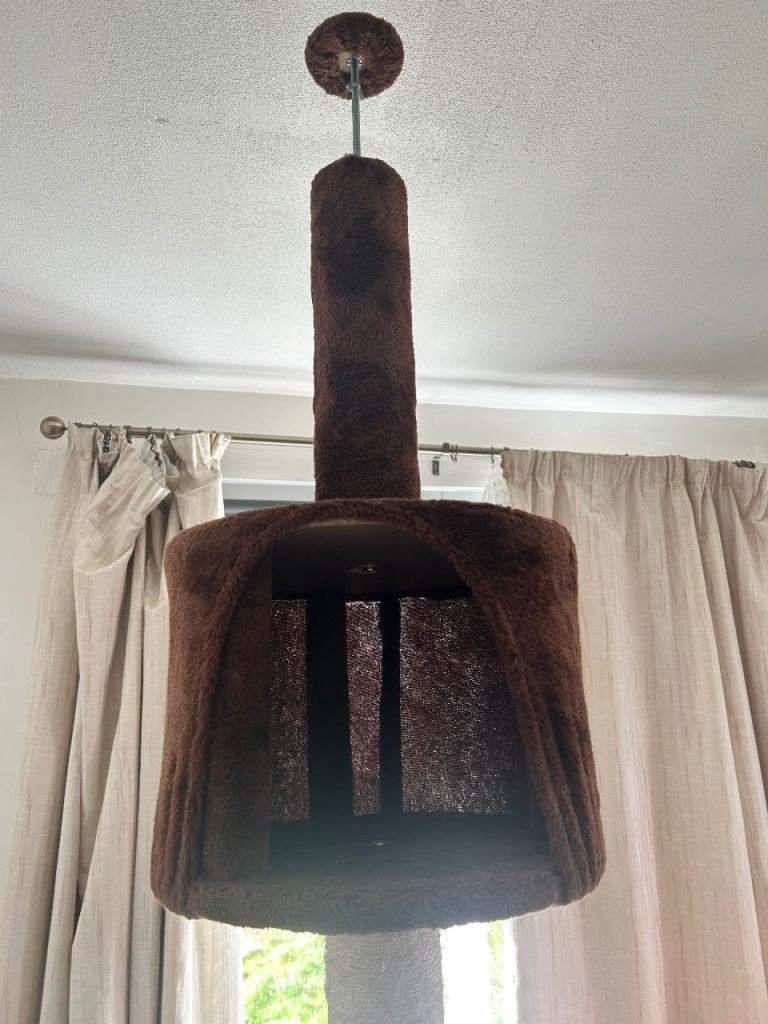 Tall cat tree that’s screws to the ceiling with a cat house and three levels with scratching post