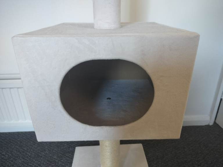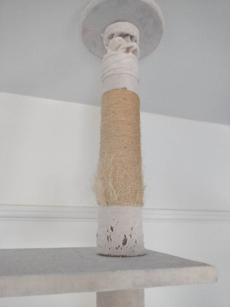 White cat tree which goes between the floor and the ceiling, does not need to be drilled into anything. The pieces can be easily assembled as you want, in any order. Has one "hiding box" and 3 shelves. Max height 2.5m but goes to low ceilings as well. Some of the bits have been used more (see picture) than the others but otherwise in good shape. About 2 years old, my cat hasn't been that interested in climbing it so selling due to a move.