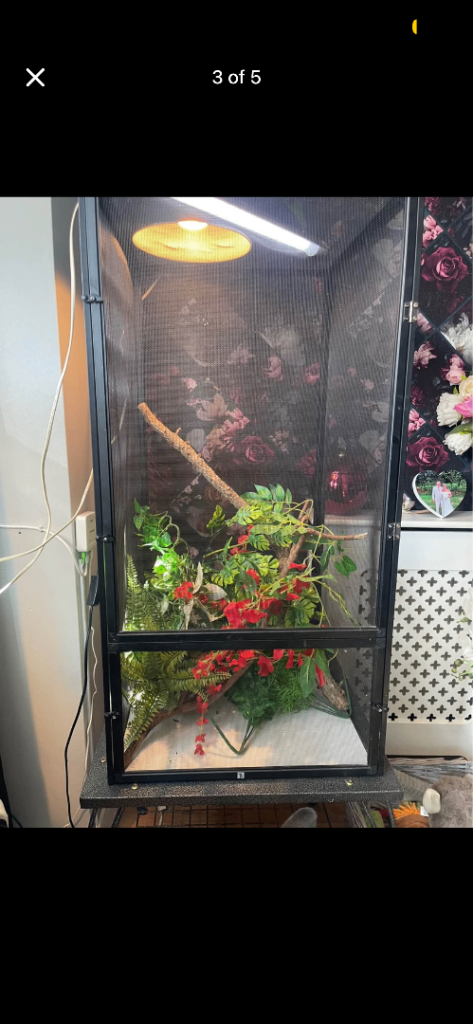 Chameleon set up 90x45x45 reptibreeze comes with the correct lighting and decor and comes with the custom built stand so you can change the bottom to a drip tray