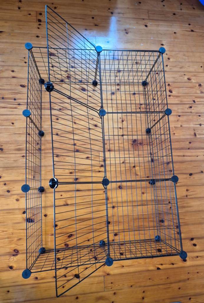 Sturdy, click together caging for Guinea pigs, rabbits, or other small animals. There's a total of 38 sections. That's enough to assemble a decent sized cage with a hinged roof, along with having enough left to assemble an exercise area. As you can see from the photos. It takes 16 sections to make the enclosed cage. Takes up very little space when stored. There's minor damage to one section, otherwise everything is in like-new condition.