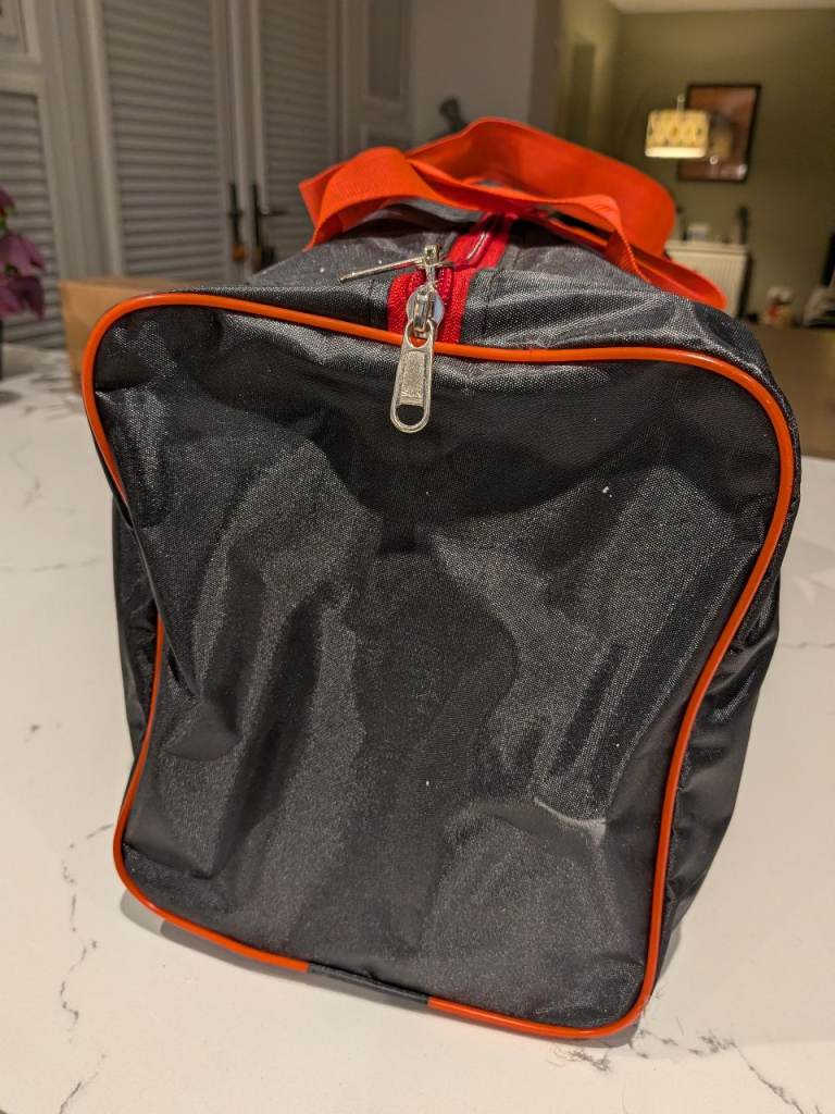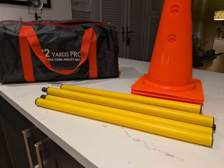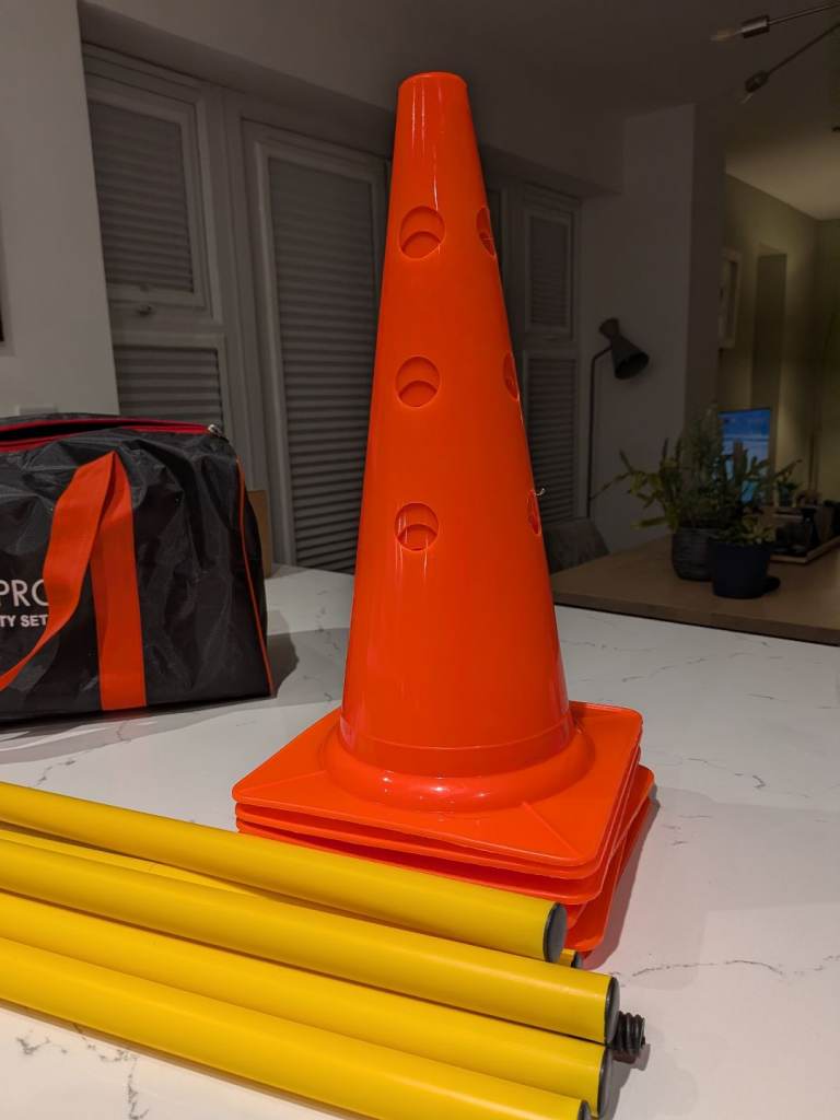 Dog agility training set with 6 cones and 3 poles (2 halves screwed together), each cone with 2 holes for adjusting height. Also good for dog rehab. Comes with carrier bag. As new, used a few times only. Buyer to collect. Less than half the price of a new set
