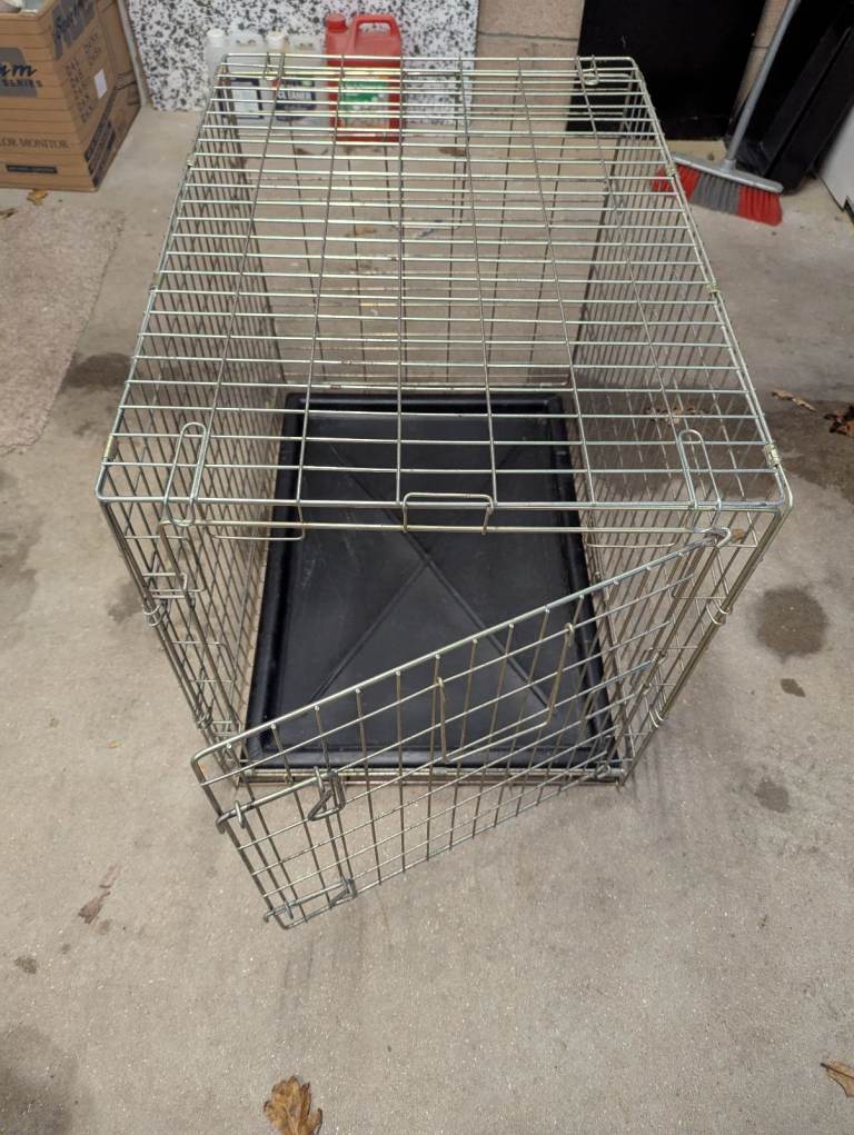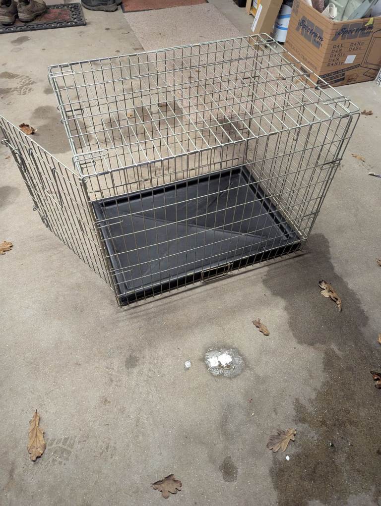Metal dog cage with plastic base tray. 30" x 21" base x 24" high. In good condition.