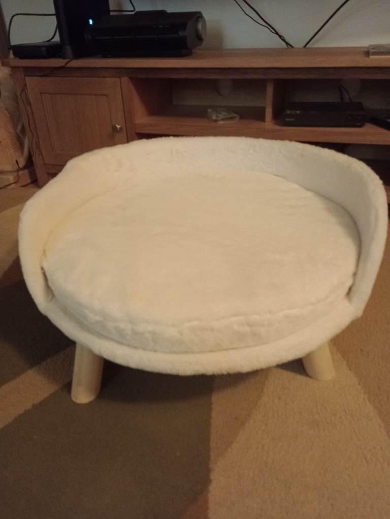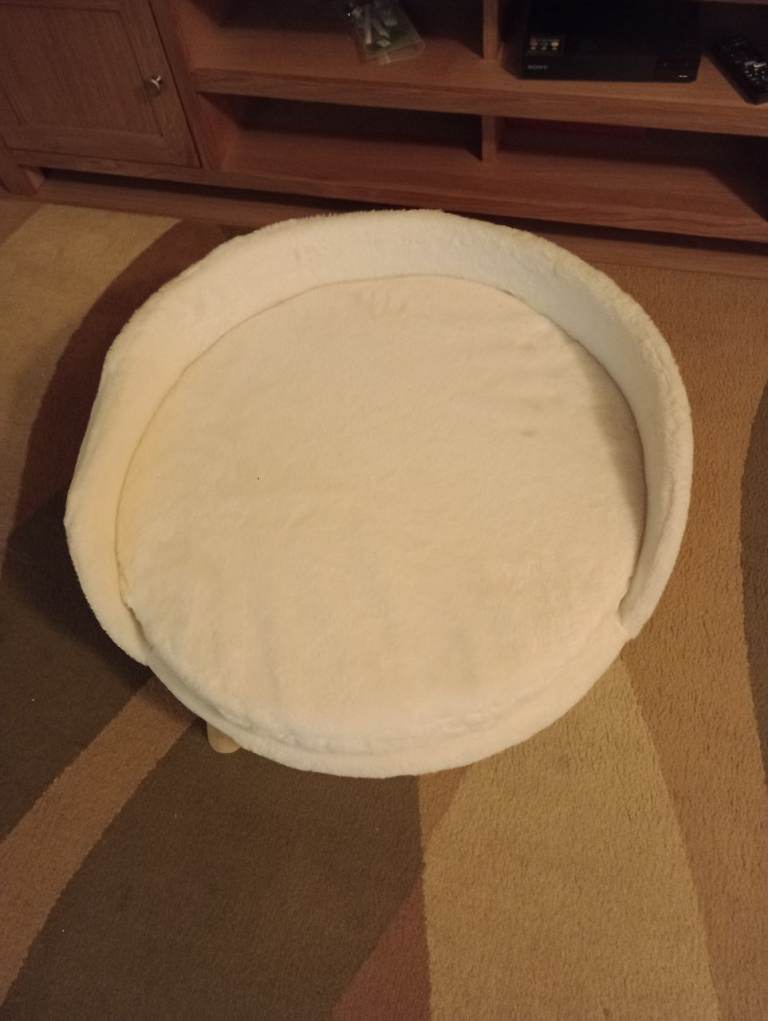 Small circular bed on removable wooden legs for small dog or cat. Removable cushion. Washable removable cover. Cream. Bought for very elderly tiny dog who will not use it. Measures 61cm across x 31cm high. 23cm from floor to cushion. Near offers considered..