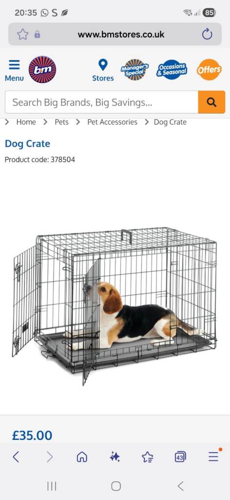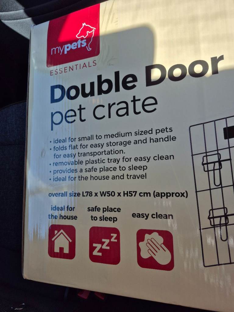 Dog crate for small/medium dogs. Easily assembled and folded down. 2 doors. Was purchased as 2nd crate for use when visiting family but never used. Has been built up to check in good order then put back in box. Currently selling for £35 in