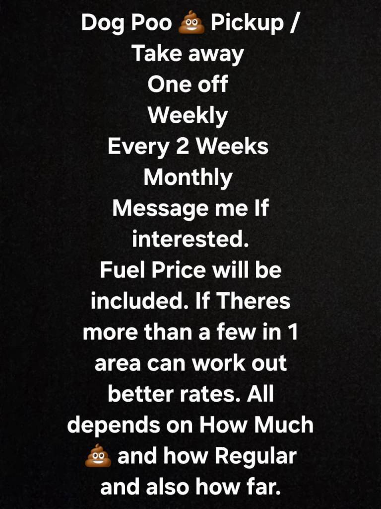 Message me and let me know if you'd like a one off pick up of all Dog Poo within a normal size garden. Or regular weekly/monthly and we can arrange from there. It all comes down to distance /dog or dogs and how many 💩 they do lol.