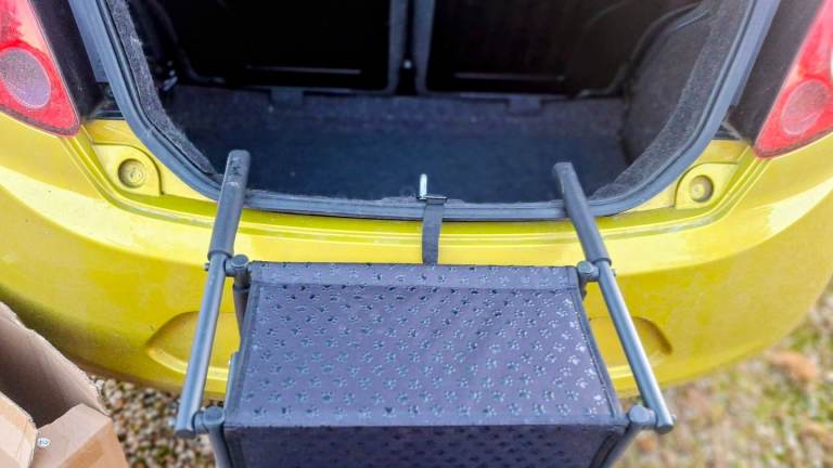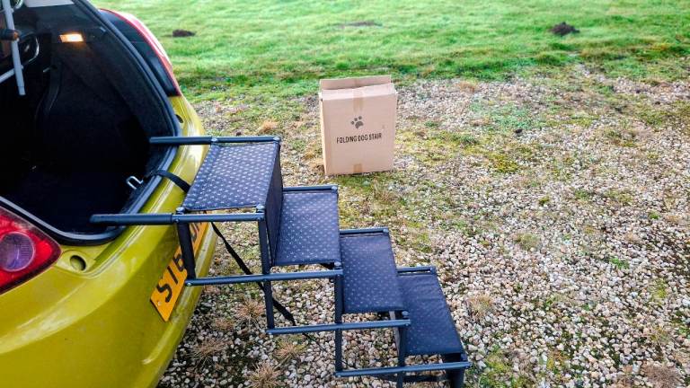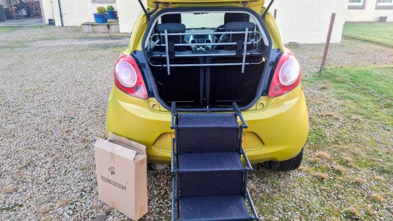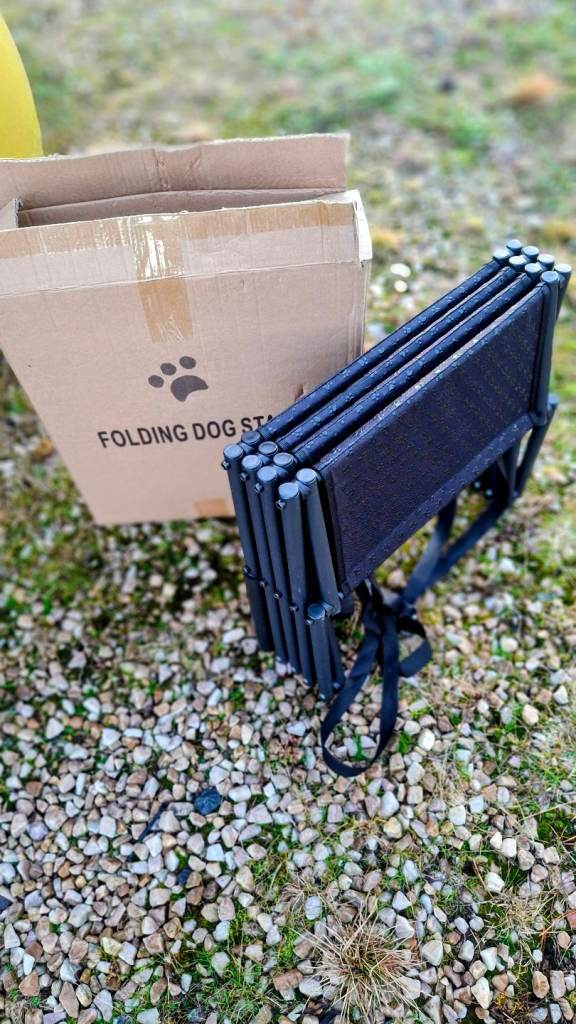 Dog ramp. Extendable stair ramp for car. Folds into box. New, tried with my dog, but his legs are too stiff!