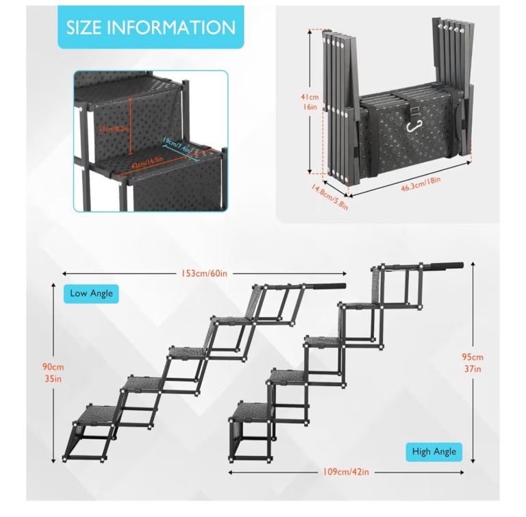 【Flexible & Foldable & Portable 】Space saving design, it can be folded when it is out of use, easy to store. Dog Stairs fold to 46.3" x 5.8" x 16" to put into the car, which is convenient to carry without taking up much space. Height adjustable range of 35"- 37", Adjustable length range of 42"-60". It can be adjusted to the right height as needed.
