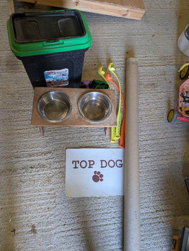 Dog items bundle. The dog bowl stand is handmade and includes 3 bowls. Collection only from Costessey