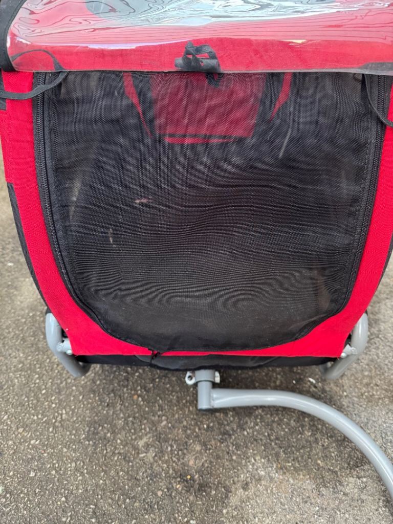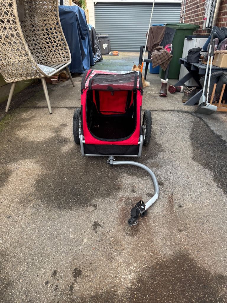 A dog trailer for carrying your precious doggy cargo while cycling. Connects easily to cycle. Cabin has 2 window openings and a mesh cover to one opening. A pouch for carrying items, bottle holder, reflectors to rear and safety flag. Leash set inside cabin for 2 dogs if needed. Instruction Book. All in very good condition .