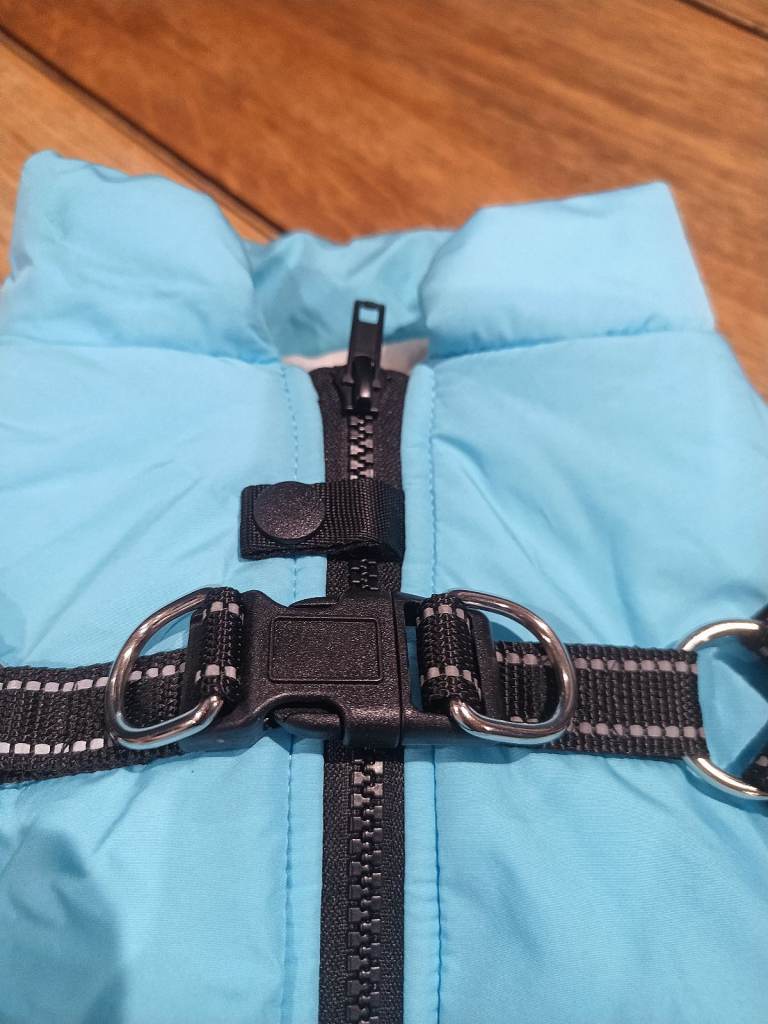 Back zipper and popper fastening with extra built in harness fastening with metal dog lead hoops.