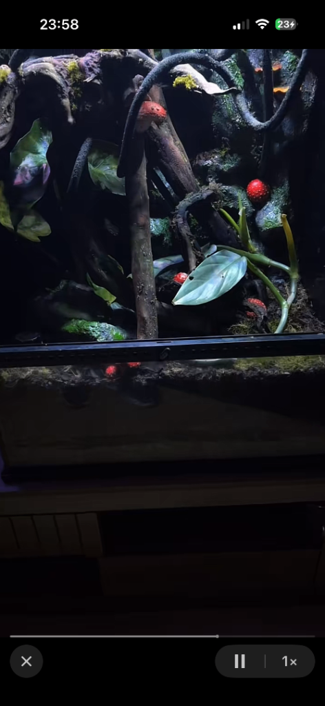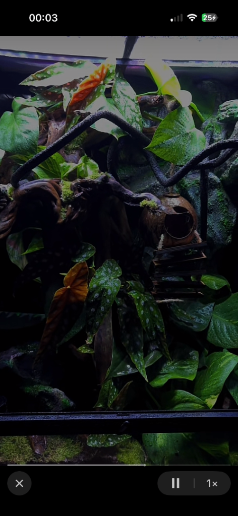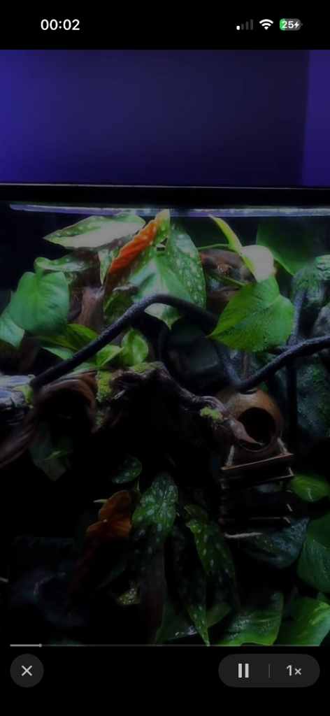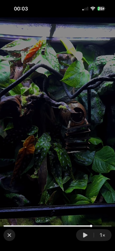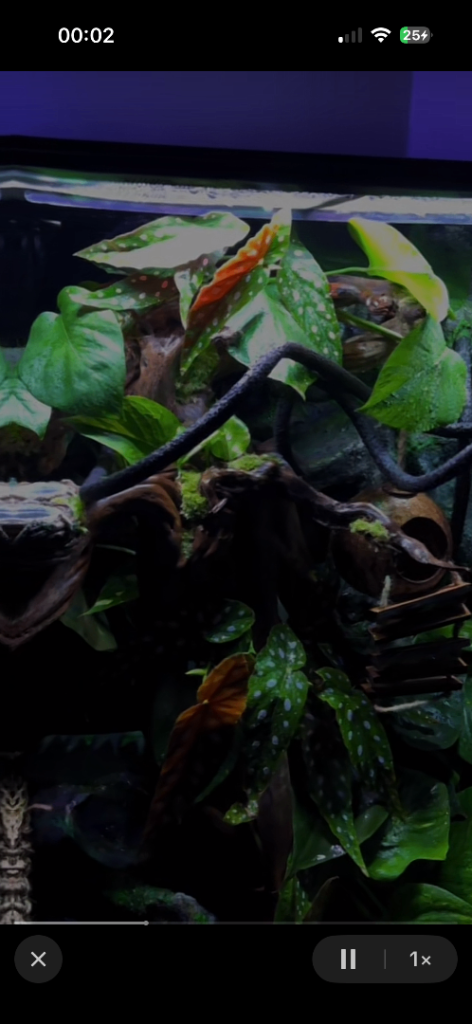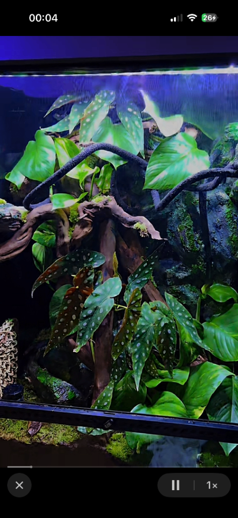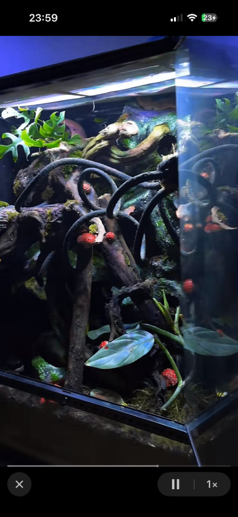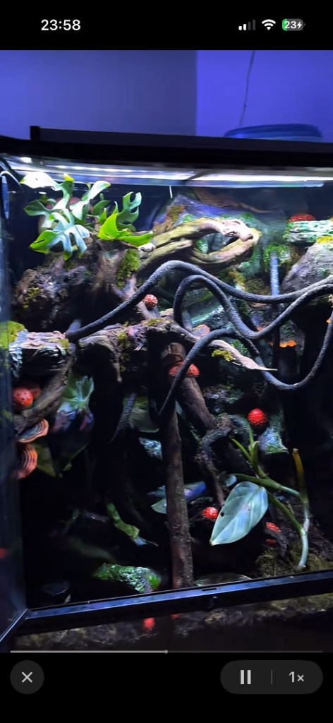 Exo terra 60x45x90 tall. full set up plants all the stuff inside including the vines expensive huge pieces of wood branches that was like 60 quid each the hygrolon fabric for growing moss and plants on stuck on the sides the 3d background is self made covers half of the back glass made from cement mix and pond sealer grey stone with moss effect painted 3 hiding coco caves built in and basking ledges aswell. It’s got the bioactive substrate springtails isopods leaf litter a good substrate mix and the drainage layer is from filter foam. The lights are a 60cm full spectrum led light and also has the led usb thermometer and hydrometer. all the mushroom ledges decor come with and it has a built in exo terra nano fan. Absolute bargain full set up for most reptiles ready to use instantly with a lot of space and made very naturalistic. Top lid iv replaced the two back mesh pieces for acrylic to help keep humidify at the back of the tank wall for growing your plants and left the front two panels mesh for air flow.