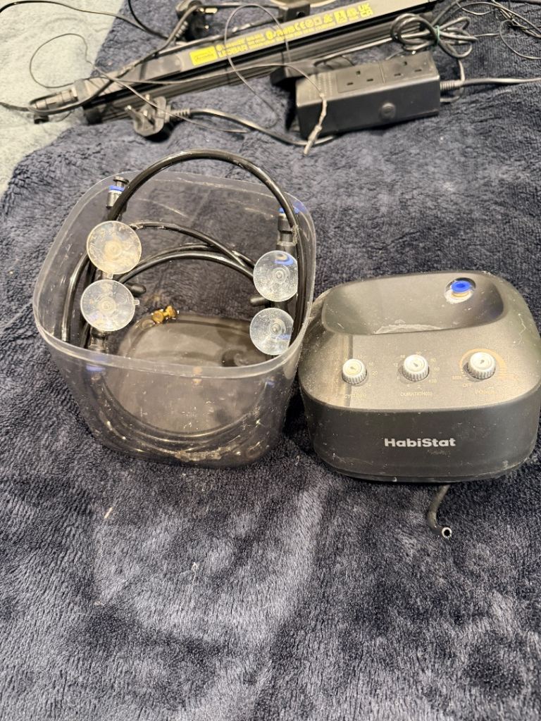 For sale comes with ceramic reflector clamp lamp, Arcadia lumenize (Bluetooth lighting) habistat water sprayer and some decorative logs. Plus Exo terra stand, 45cmx60cmx70.5cm.