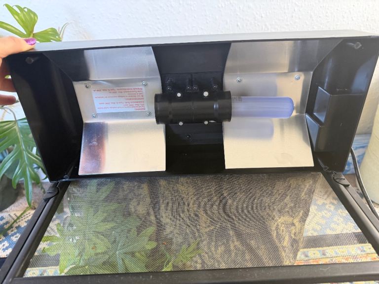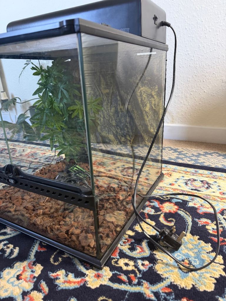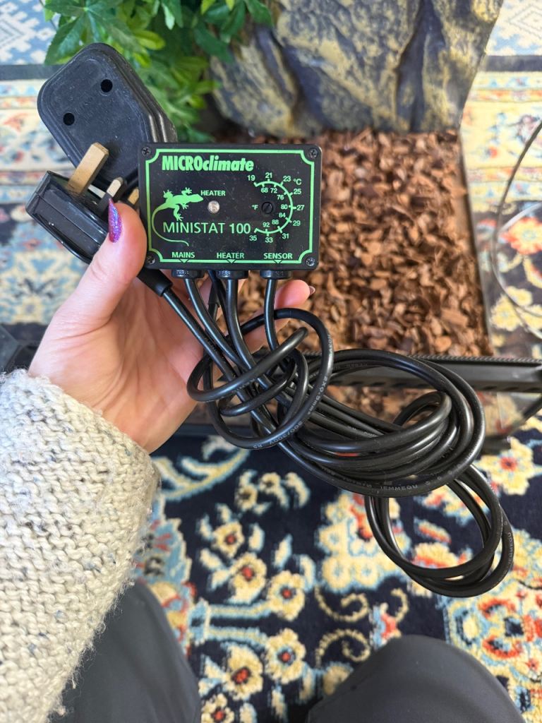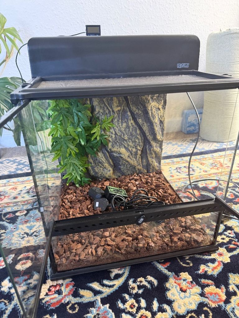 Exoterra Terrarium 45cm x 45cm x 45cm with the textured background foam, fitted tank hood and compact top hood for UV bulbs/infrared bulbs with thermometer. and ministat thermostat for use with heat mats (heat mat not included). All in perfect working order, just needs a new battery in the thermometer and bulbs for the tank hood as current UV bulb works but is old and output will not be strong due to bulbs age.
