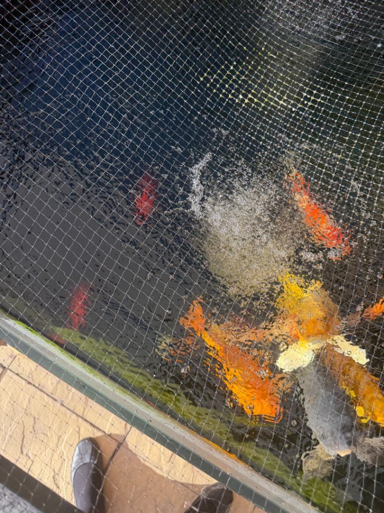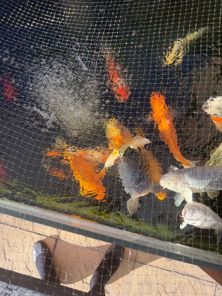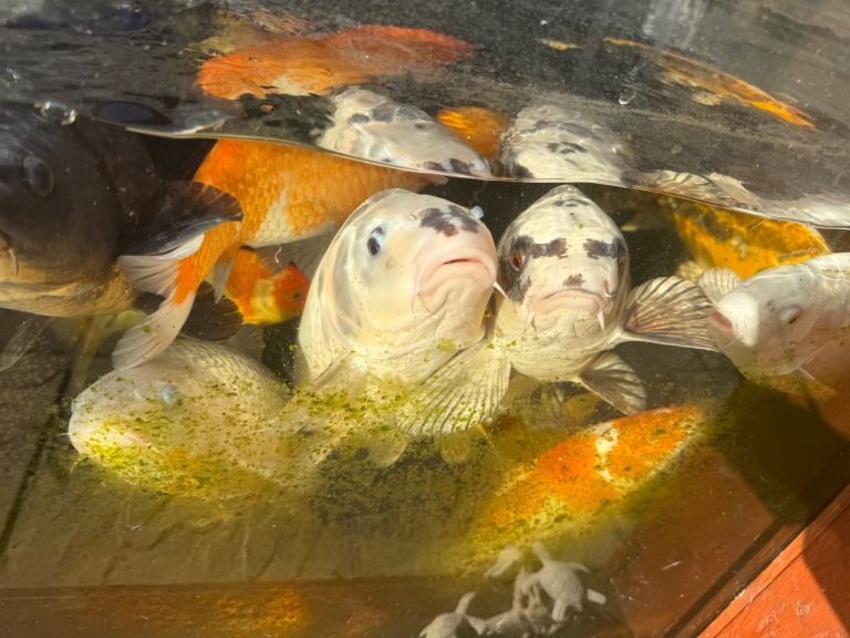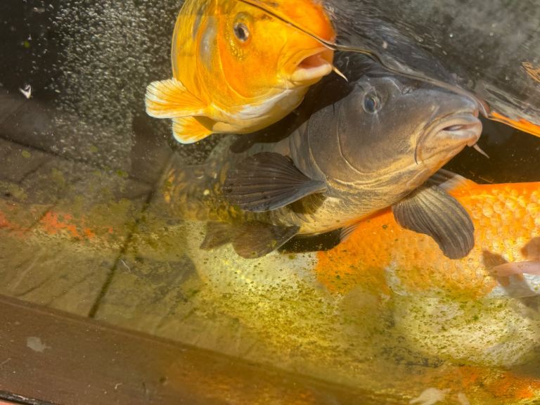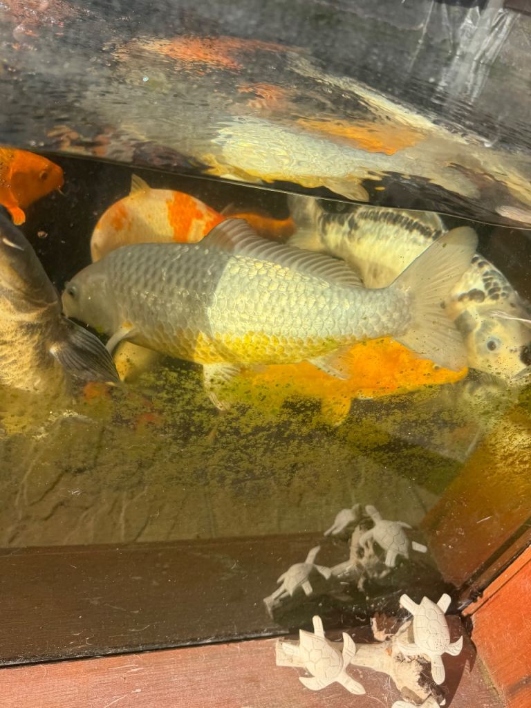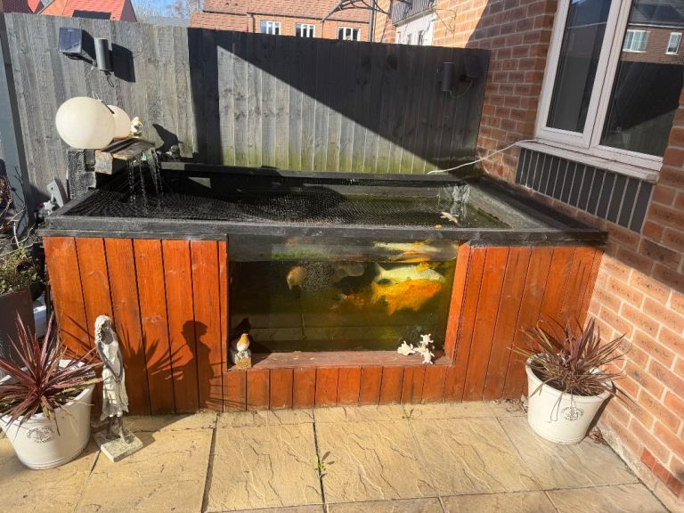 Fish Pond with glass window and fish air stones pumps mature fish Koi testing the waters ideally would like it to go as a hole but obviously fish need to go first
