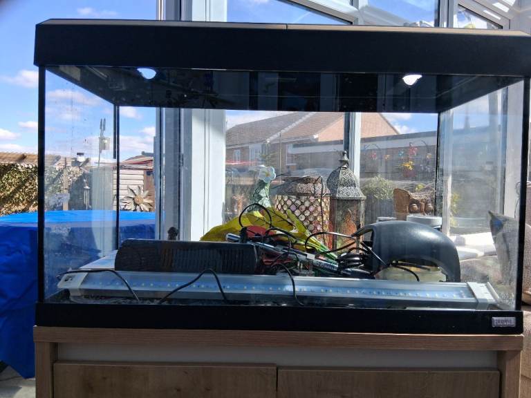 Fluval Roma125 Aquarium complete setup, including Fluval LED lights, a 150w heater, and a U3 filter (lid has cutouts for an external filter). Comes with a Tetra air pump, artificial plants, a large rock, assorted aquarium equipment, and gravel. Dimensions are 80cm x 45cm x 49cm, and it requires two or more people to move.